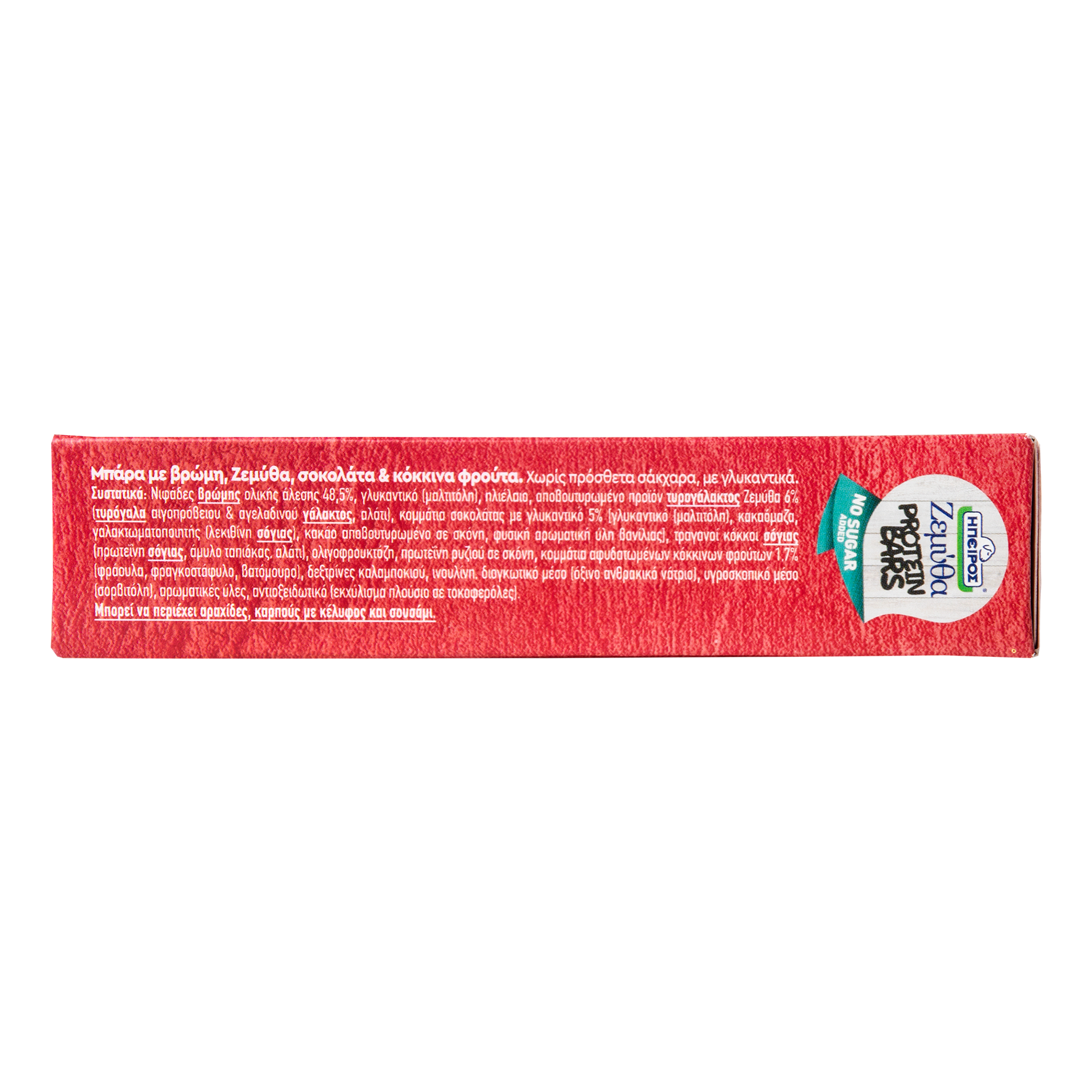 Νιφάδες βρώμης ολικής άλεσης 48,5%, γλυκαντικό (μαλτιτόλη), ηλιέλαιο, αποβουτυρωμένο προϊόν τυρογάλακτος Ζεμύθα 6% (τυρόγαλα αιγοπρόβειου & αγελαδινού γάλακτος, αλάτι), κομμάτια σοκολάτας με γλυκαντικό 5% [γλυκαντικό (μαλτιτόλη), κακαόμαζα, γαλακτωματοποιητής (λεκιθίνη σόγιας), κακάο αποβουτυρωμένο σε σκόνη, φυσική αρωματική ύλη βανίλιας], τραγανοί κόκκοι σόγιας (πρωτεΐνη σόγιας, άμυλο ταπιόκας, αλάτι), ολιγοφρουκτόζη, πρωτεΐνη ρυζιού σε σκόνη, κομμάτια αφυδατωμένων κόκκινων φρούτων 1,7% (φράουλα, φραγκοστάφυλο, βατόμουρο), δεξτρίνες καλαμποκιού, ινουλίνη, διογκωτικό μέσο (όξινο ανθρακικό νάτριο), υγροσκοπικό μέσο (σορβιτόλη), αρωματικές ύλες, αντιοξειδωτικό (εκχύλισμα πλούσιο σε τοκοφερόλες).Αλλεργιογόνα