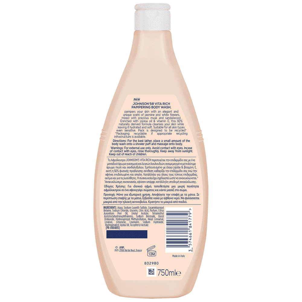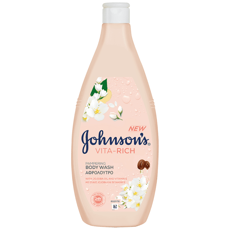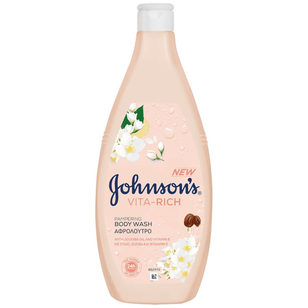 Το JOHNSON’S VITA-RICH Pampering Body Wash περιποιείται την επιδερμίδα σας με ένα κομψό και μοναδικό άρωμα γιασεμιού και λευκών λουλουδιών, αναμεμειγμένο με πολύτιμο μόσχο και σανδαλόξυλο.