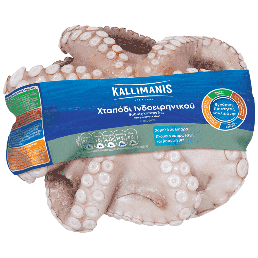 Το χταπόδι KALLIMANIS διατηρεί όλη τη φρεσκάδα και τη θρεπτική αξία της θάλασσας, χάρη στην άμεση κατάψυξή του αφού αλιευθεί. Προσέχουμε πάντα την περίοδο αλιείας, καθαρίζουμε προσεκτικά την κουκούλα του, το παραγουλίζουμε και το καταψύχουμε αμέσως. Η ανώτερη ποιότητά του είναι αντιληπτή από τις ολοστρόγγυλες, στητές βεντούζες του και το γυαλιστερό στητό του δέρμα. Ξεχωρίζει για τη μαλακή του σάρκα και τη γεύση του ενώ ενδείκνυται για πλήθος συνταγών και τρόπων μαγειρέματος. Το χταπόδι αποτελεί φυσική πηγή πλούσια σε πρωτεϊνη και βιταμίνη Β12 και με χαμηλή περιεκτικότητα σε λιπαρά.
