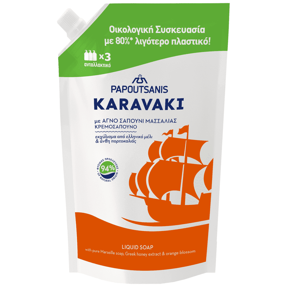 Το νέο κρεμοσάπουνο PAPOUTSANIS KARAVAKI, με απαλή σύνθεση και 94% συστατικά φυσικής προέλευσης, εμπλουτισμένο με βιολογικό εκχύλισμα από ελληνικό μέλι και άρωμα από άνθη πορτοκαλιάς, καθαρίζει σε βάθος, ενώ ενυδατώνει και προστατεύει τα χέρια σας. Ιδανικό για όλη την οικογένεια. Σε ανταλλακτικά σακουλάκια, από 100% ανακυκλώσιμο υλικό.
