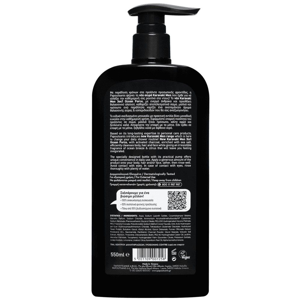 Aqua, Sodium Laureth Sulfate, Cocamidopropyl Betaine, Glycerin, Parfum, Sodium Chloride, Ammonium Acryloyldimethyltaurate/VP Copolymer, Sodium Benzoate, Phenoxyethanol, Glyceryl Oleate, PEG-200 Hydrogenated Glyceryl Palmate, PEG-7 Glyceryl Cocoate, Polycitronellol, Sodium Methyl Cocoyl Taurate, Citric Acid, Hydroxypropyl Guar Hydroxypropyltrimonium Chloride, Tetrasodium Glutamate Diacetate, Hydrolyzed Yeast Protein, Butylene Glycol, t-Butyl Alcohol, Glycol Distearate, Fomes Officinalis Extract, Pyridoxine HCL, Niacinamide, Panthenol, Charcoal Powder, Glycol Stearate, Volcanic Soil Extract, Allantoin, Threonine, Chlorphenesin, Biotin, PEG-40 Hydrogenated Castor Oil, Lecithin, Ascorbyl Palmitate, Tocopherol, Hydrogenated Palm Glycerides Citrate, Potassium Sorbate, Linalyl Acetate, Limonene, Linalool, Citrus Aurantium Peel Oil, Alpha-Isomethyl Ionone.