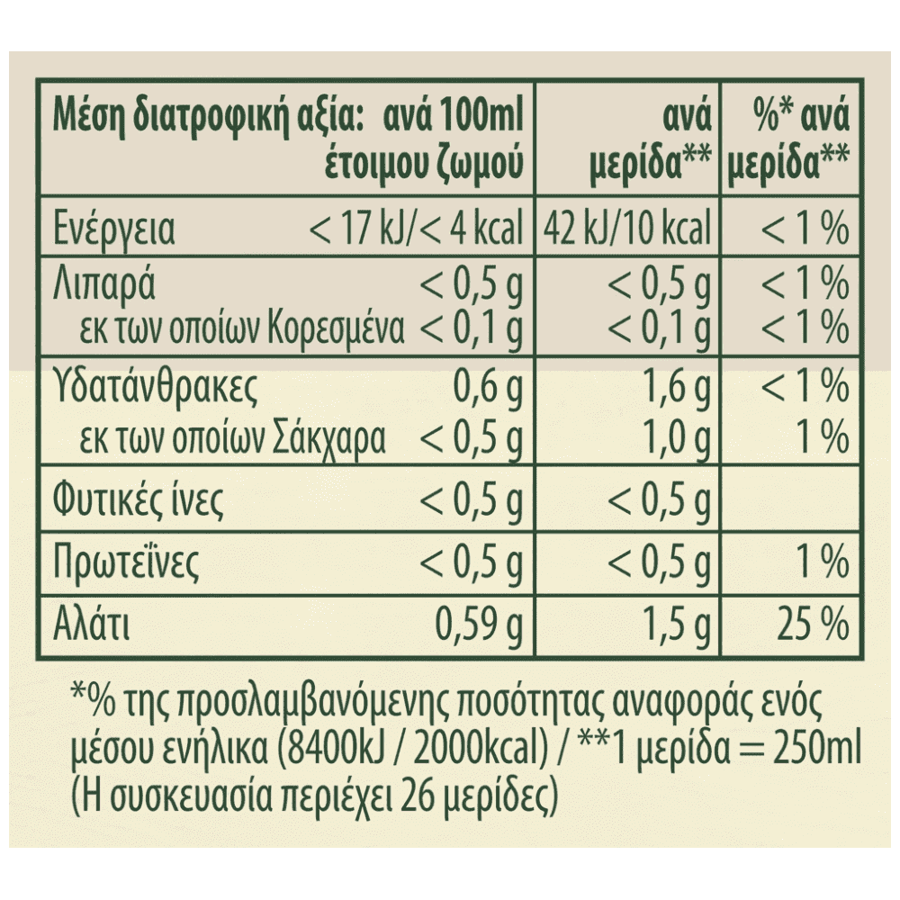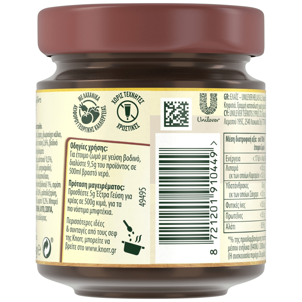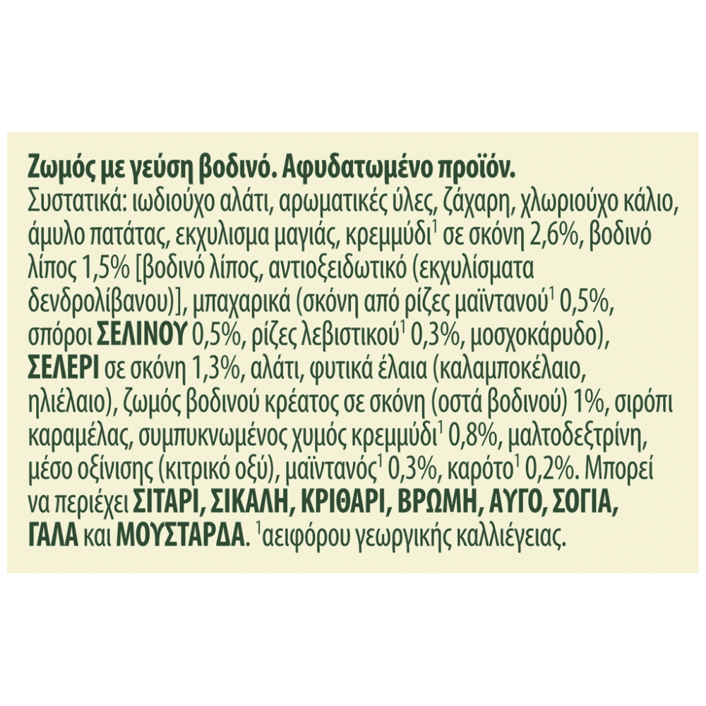ιωδιούχο αλάτι, φυσικές αρωματικές ύλες, ζάχαρη, χλωριούχο κάλιο, άμυλο πατάτας, εκχυλισμα μαγιάς, κρεμμύδι σε σκόνη 2,6%, βοδινό λίπος 1,5% (βοδινό κρέας, αντιοξειδωτικό (εκχυλίσματα δενδρολίβανου)), μπαχαρικά (σκόνη από ρίζες μαϊντανού 0,5%, σπόροι ΣΕΛΙΝΟΥ 0,5%, ρίζες λεβιστικού, μοσχοκάρυδο), ΣΕΛΕΡΙ σε σκόνη 1,3%, αλάτι, φυτικά έλαια (καλαμποκέλαιο, ηλιέλαιο), ζωμός βοδινού κρέατος σε σκόνη (οστά βοδινού) 1%, σιρόπι καραμέλας, συμπυκνωμένος χυμός κρεμμύδι, μαλτοδεξτρίνη, μέσο οξίνισης (κιτρικό οξύ), μαϊντανός, καρότο. Μπορεί να περιέχει ΣΙΤΑΡΙ, ΣΙΚΑΛΗ, ΚΡΙΘΑΡΙ, ΒΡΩΜΗ, ΑΥΓΟ, ΣΟΓΙΑ, ΓΑΛΑ και ΜΟΥΣΤΑΡΔΑΑλλεργιογόνα