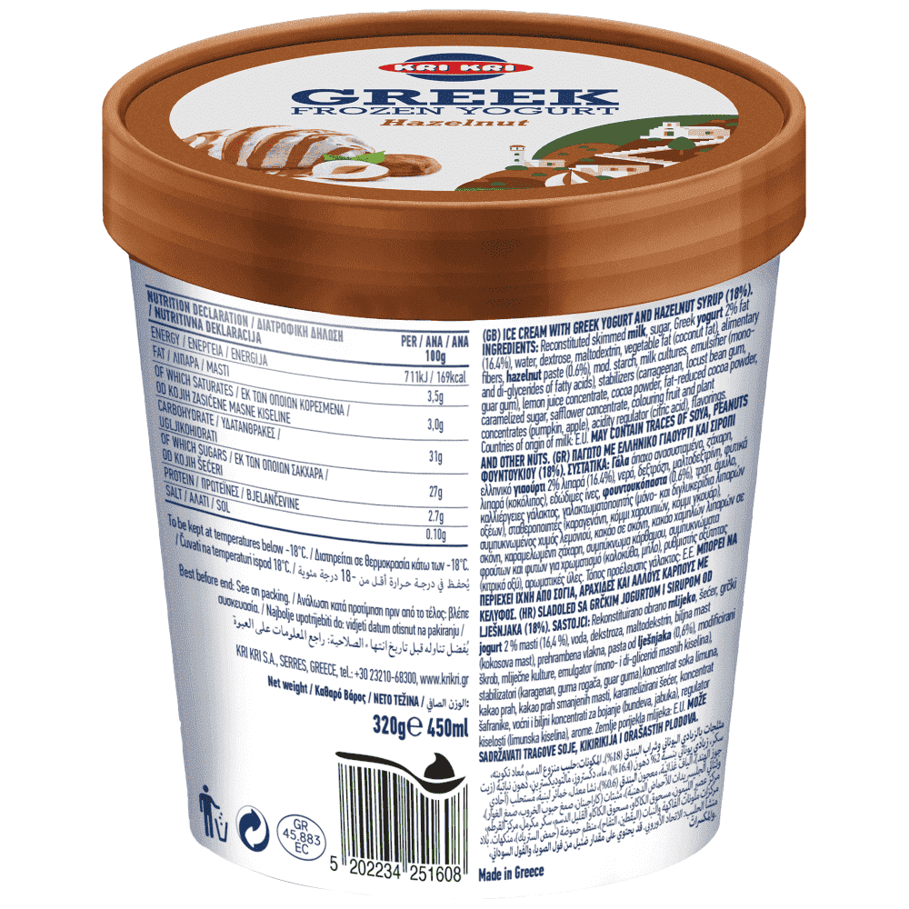 Γάλα άπαχο ανασυσταμένο, ζάχαρη, ελληνικό γιαούρτι 2% λιπαρά (16.4%), νερό, δεξτρόζη, μαλτοδεξτρίνη, φυτικά λιπαρά (κοκόλιπος), εδώδιμες ίνες, φουντουκόπαστα (0.6%), τροπ. άμυλο, καλλιέργειες γάλακτος, γαλακτωματοποιητής (μόνο- και διγλυκερίδια λιπαρών οξέων), σταθεροποιητές (καραγενάνη, κόμμι χαρουπιών, κόμμι γκουάρ), συμπυκνωμένος χυμός λεμονιού, κακάο σε σκόνη, κακάο χαμηλών λιπαρών σε σκόνη, καραμελωμένη ζάχαρη, συμπύκνωμα κάρθαμου, συμπυκνώματα φρούτων και φυτών για χρωματισμό (κολοκύθα, μήλο), ρυθμιστής οξύτητας (κιτρικό οξύ), αρωματικές ύλες. Τόπος προέλευσης γάλακτος: Ε.Ε. INGREDIENTS: Reconstituted skimmed milk, sugar, Greek yogurt 2% fat (16.4%), water, dextrose, maltodextrin, vegetable fat (coconut fat), alimentary fibers, hazelnut paste (0.6%), mod. starch, milk cultures, emulsifier (mono- and di-glycerides of fatty acids), stabilizers (carrageenan, locust bean gum, guar gum), lemon juice concentrate, cocoa powder, fat-reduced cocoa powder, caramelized sugar, safflower concentrate, colouring fruit and plant concentrates (pumpkin, apple), acidity regulator (citric acid), flavorings. Countries of origin of milk: E.U.Αλλεργιογόνα