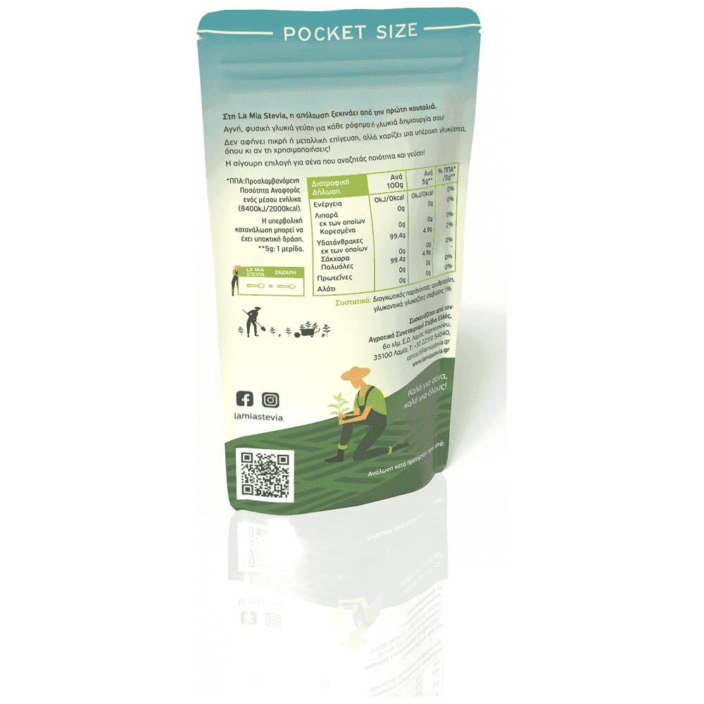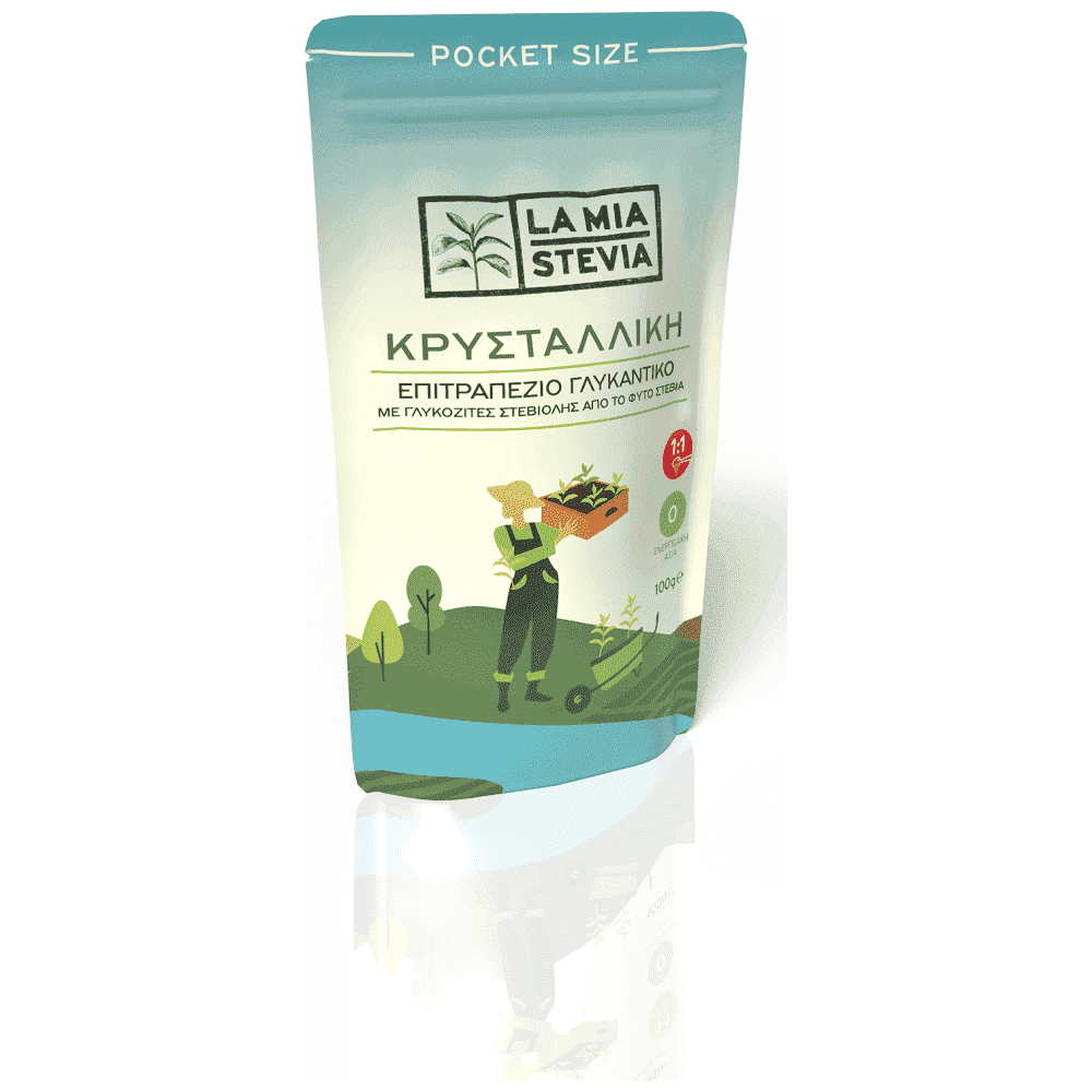 Κρυσταλλική Στέβια (1:1) 100gr. Συσκευάζεται από τον Αγροτικό Συνεταιρισμό Στέβια Ελλάς. Δεν αφήνει πικρή ή μεταλλική επίγευση, αλλά χαρίζει μια υπέροχη γλυκύτητα, όπου κι αν χρησιμοποιηθεί. Ιδανική επιλογή για καφέ, ροφήματα και γλυκά. Αντικαθιστά πλήρως την ζάχαρη σε κάθε παρασκευή! 1 κουταλιά ισοδυναμεί με 1 κουταλιά ζάχαρης! Δεν περιέχει θερμίδες και δεν μεταβάλλει τον γλυκαιμικό δείκτη.