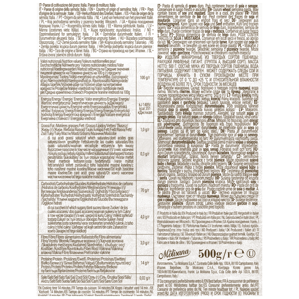 Αυθεντικά Ιταλικά Ζυμαρικά Conchiglioni premium ποιότητας, σε σχήμα κοχυλιού από 100% ιταλικό σιμιγδάλι σκληρού σίτου βιώσιμης καλλιέργειας. Η αποφλοίωση του σιταριού γίνεται παραδοσιακά με πέτρες, ενώ το καλούπι από μπρούτζο δίνει στα ζυμαρικά La Molisana μια ελαφρώς τραχιά υφή που παγιδεύει την σάλτσα στα μακαρόνια και κορυφώνει την γευστική μας απόλαυση. Ιδιαίτερα ανθεκτικά στο μαγείρεμα, εύπεπτα και υψηλής περιεκτικότητας σε πρωτεΐνη.