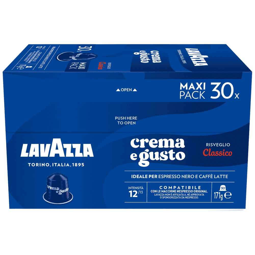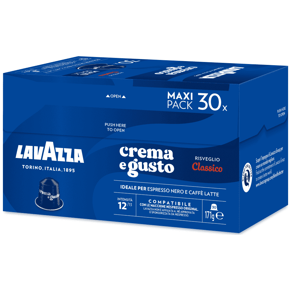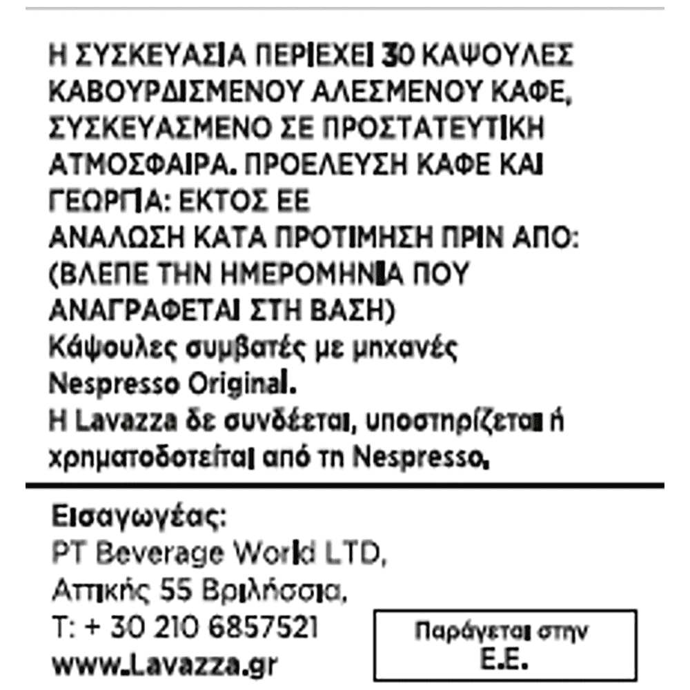 Παράχθηκε για Luigi Lavazza S.p.A. Περιγραφή: Κάψουλες μίας δόσης αλεσμένου καφέ. Ένταση: 12. Καθαρή ποσότητα: 52g. Συσκευασία: Πακέτο με 30 κάψουλες καφέ. Διανέμεται από τη P.T. Beverage World.