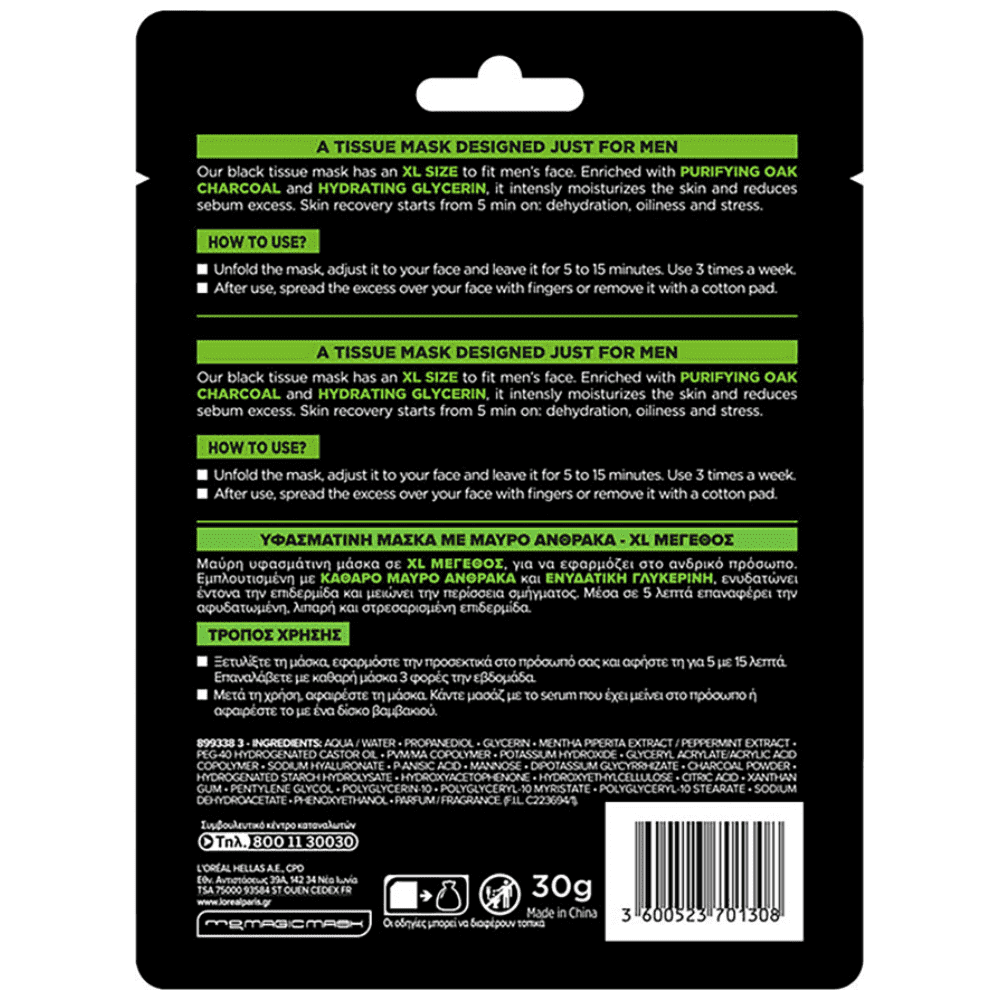 "Μαύρη υφασμάτινη μάσκα σε XL MEΓΕΘΟΣ, για να εφαρμόζει κατάλληλα στο ανδρικό πρόσωπο. Εμπλουτισμένη με ΚΑΘΑΡΟ ΜΑΥΡΟ ΑΝΘΡΑΚΑ και ΕΝΥΔΑΤΙΚΗ ΓΛΥΚΕΡΙΝΗ, ενυδατώνει έντονα την επιδερμίδα και μειώνει την περίσσεια σμήγματος. Μέσα σε 5 μόλις λεπτά επαναφέρει την αφυδατωμένη, λιπαρή και στρεσαρισμένη επιδερμίδα."