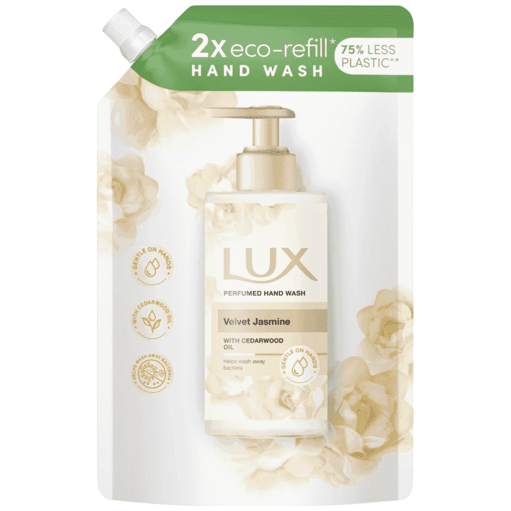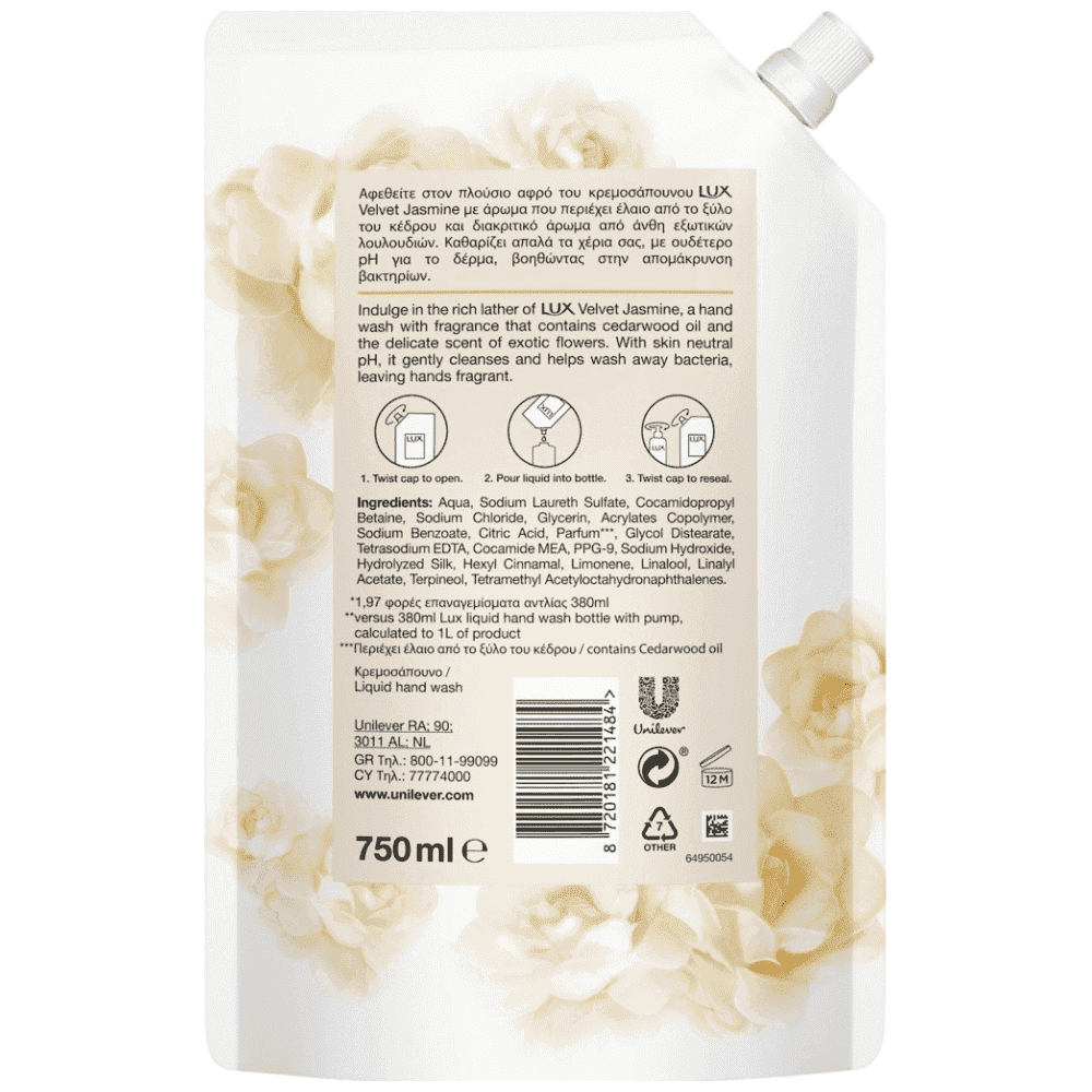 Αφεθείτε στον πλούσιο αφρό του κρεμοσάπουνου Lux Velvet Jasmine με άρωμα που περιέχει έλαιο από το ξύλο του κέδρου και διακριτικό άρωμα απο άνθη εξωτικών λουλουδιών. Καθαρίζει απαλά τα χέρια σας, με ουδέτερο pH για το δέρμα, βοηθώντας στην απομάκρυνση βακτηρίων.