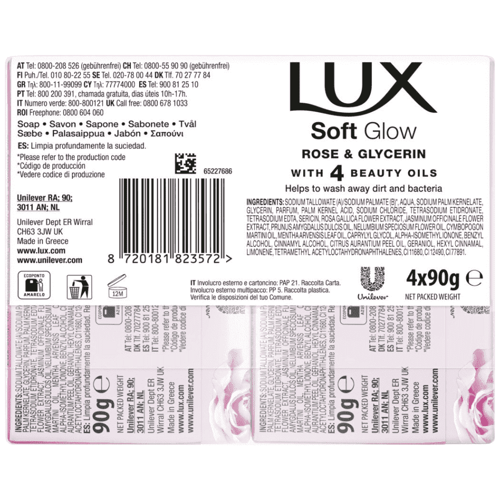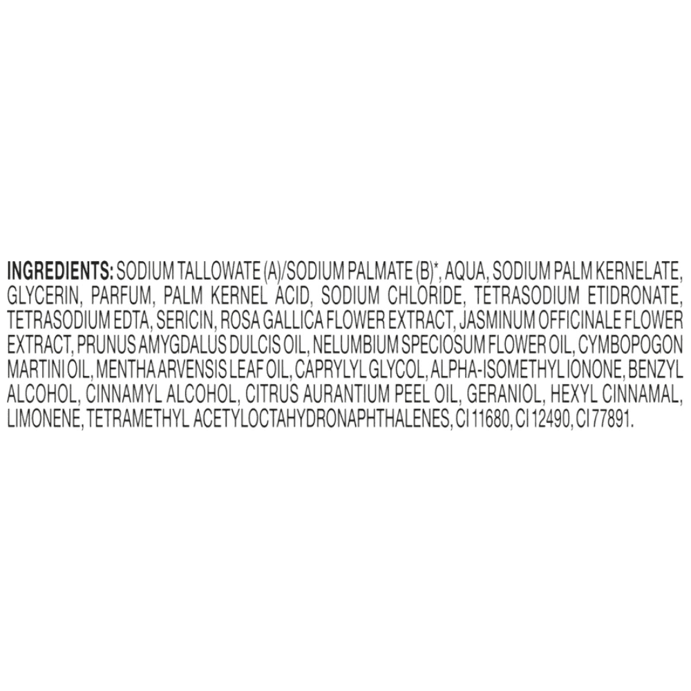 SODIUM TALLOWATE (A)/SODIUM PALMATE (B)*, AQUA, SODIUM PALM KERNELATE, GLYCERIN, PARFUM, PALM KERNEL ACID, SODIUM CHLORIDE, TETRASODIUM ETIDRONATE, TETRASODIUM EDTA, SERICIN, ROSA GALLICA FLOWER EXTRACT, JASMINUM OFFICINALE FLOWER EXTRACT, PRUNUS AMYGDALUS DULCIS OIL, NELUMBIUM SPECIOSUM FLOWER OIL, CYMBOPOGON MARTINI OIL, MENTHA ARVENSIS LEAF OIL, CAPRYLYL GLYCOL, ALPHA-ISOMETHYLIONONE, BENZYL ALCOHOL, CINNAMYL ALCOHOL, CITRUS AURANTIUM PEEL OIL, GERANIOL, HEXYL CINNAMAL, LIMONENE, TETRAMETHYL ACETYLOCTAHYDRONAPHTHALENES, CI 11680, CI 12490, CI 77891.Αλλεργιογόνα