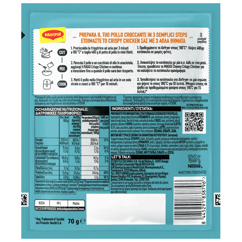 Τριμμένο ψωμί (αλεύρι ΣΙΤΑΡΙΟΥ, αλάτι, δεξτρόζη, μαγιά), μείγμα με καλαμπόκι (καλαμπόκι, νιφάδες καλαμποκιού, εκχύλισμα βύνης ΚΡΙΘΑΡΙΟΥ, αλάτι, ζάχαρη), ηλιέλαιο, ασπράδι ΑΥΓΟΥ σε σκόνη, κρεμμύδι σε σκόνη, μείγμα τυριών σε σκόνη (ΓΑΛΑ) 4,5% (τυρί κρέμα, cheddar, camembert, μπλε τυρί), αλάτι, ζάχαρη, σκόρδο σε σκόνη, αρωματική ύλη (περιέχει ΓΑΛΑ), αποξηραμένη κόκκινη καυτερή πιπεριά (τσίλι), αποξηραμένη κόκκινη πιπεριά. Περιέχει ΓΛΟΥΤΕΝΗ (ΣΙΤΑΡΙ, ΚΡΙΘΑΡΙ), ΑΥΓΟ και ΓΑΛΑ.