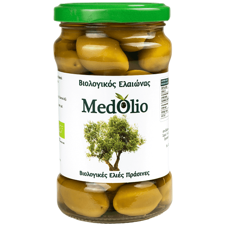 Ελιές πράσινες Βιολογικές, νερό,αλάτι. Ρυθμιστής οξύτητας : Γαλακτικό οξύ