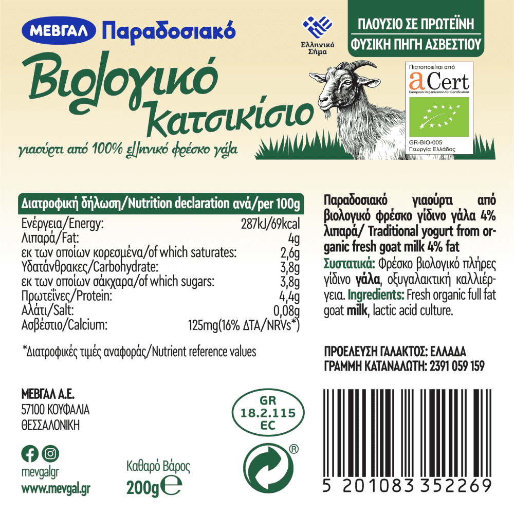 ΠΑΡΑΔΟΣΙΑΚΟ ΓΙΑΟΥΡΤΙ ΒΙΟΛΟΓΙΚΟ ΚΑΤΣΙΚΙΣΙΟ 200ΓΡ Αυθεντική γεύση παραδοσιακού κατσικίσιου γιαουρτιού με την παραδοσιακή «πέτσα». Με 100% φρέσκο ελληνικό βιολογικό γάλα, το οποίο συλλέγεται από ελληνικές πιστοποιημένες βιολογικές κτηνοτροφικές μονάδες. Πλούσιο σε πρωτεΐνη και φυσική πηγή ασβεστίου, ιδανικό για όσους αναζητούν αγνή απόλαυση και υψηλή θρεπτική αξία.