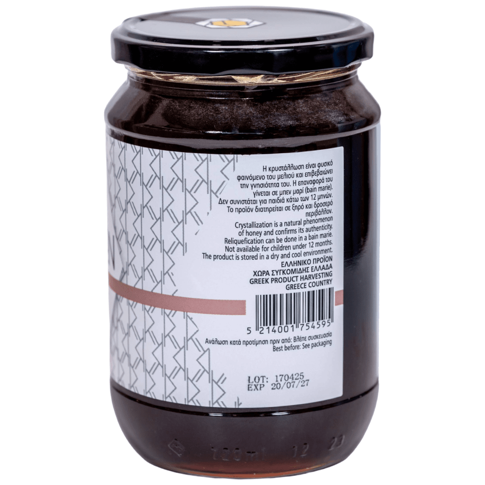 Οργανοληπτικά Χαρακτηριστικά Χρώμα: Σκούρο κεχριμπαρένιο έως καστανό με κοκκινωπές ανταύγειες Άρωμα: Πλούσιο, γήινο με νότες ξηρών καρπών και δασικών αρωμάτων Γεύση: Γλυκόπικρη, έντονη και γεμάτη, με μακρά επίγευση Κρυστάλλωση: Φυσική διαδικασία που εμφανίζεται μετά από 6-9 μήνες, ένδειξη αγνότητας