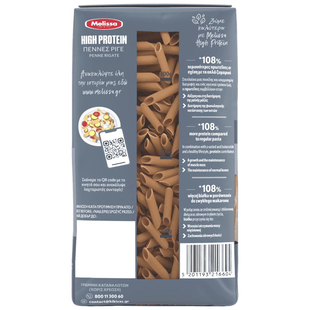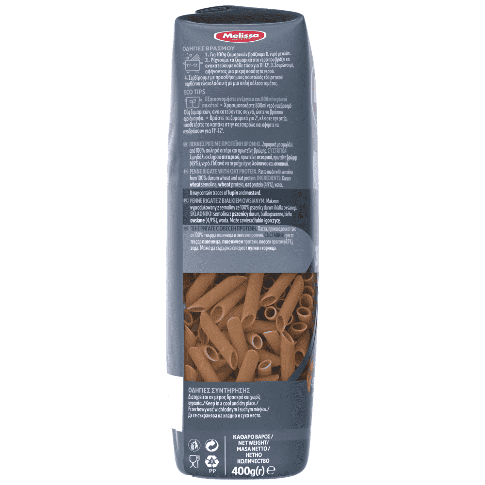 Πέννες ριγέ με πρωτεΐνη βρώμης. Φτιαγμένα με σιμιγδάλι από 100% σκληρό σιτάρι και φυσική πρωτεΐνη βρώμης. Περιέχουν +50% περισσότερη πρωτεΐνη σε σχέση με τα απλά ζυμαρικά.