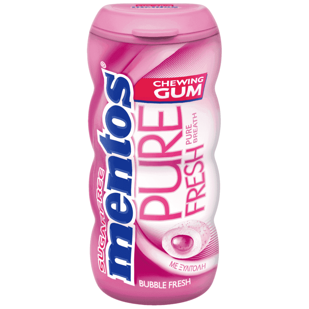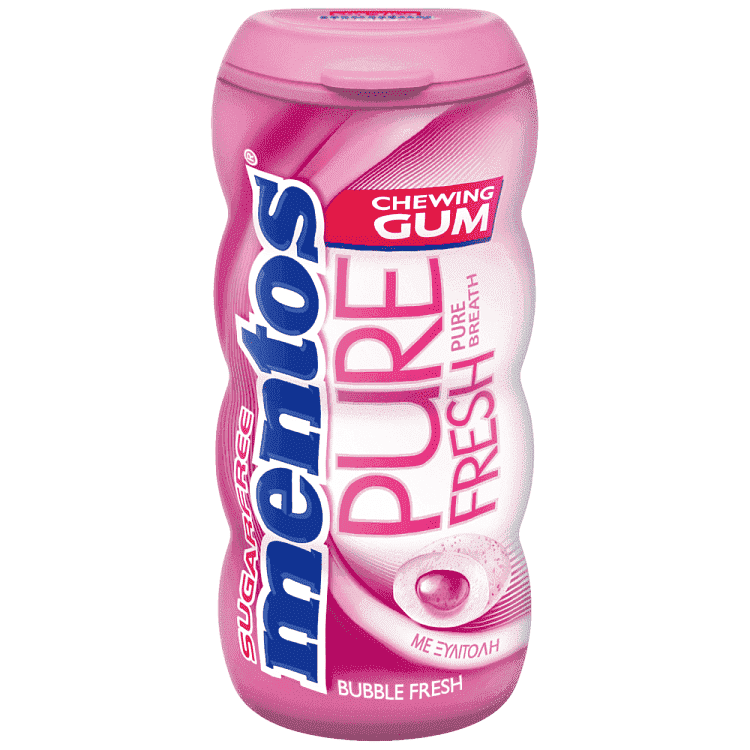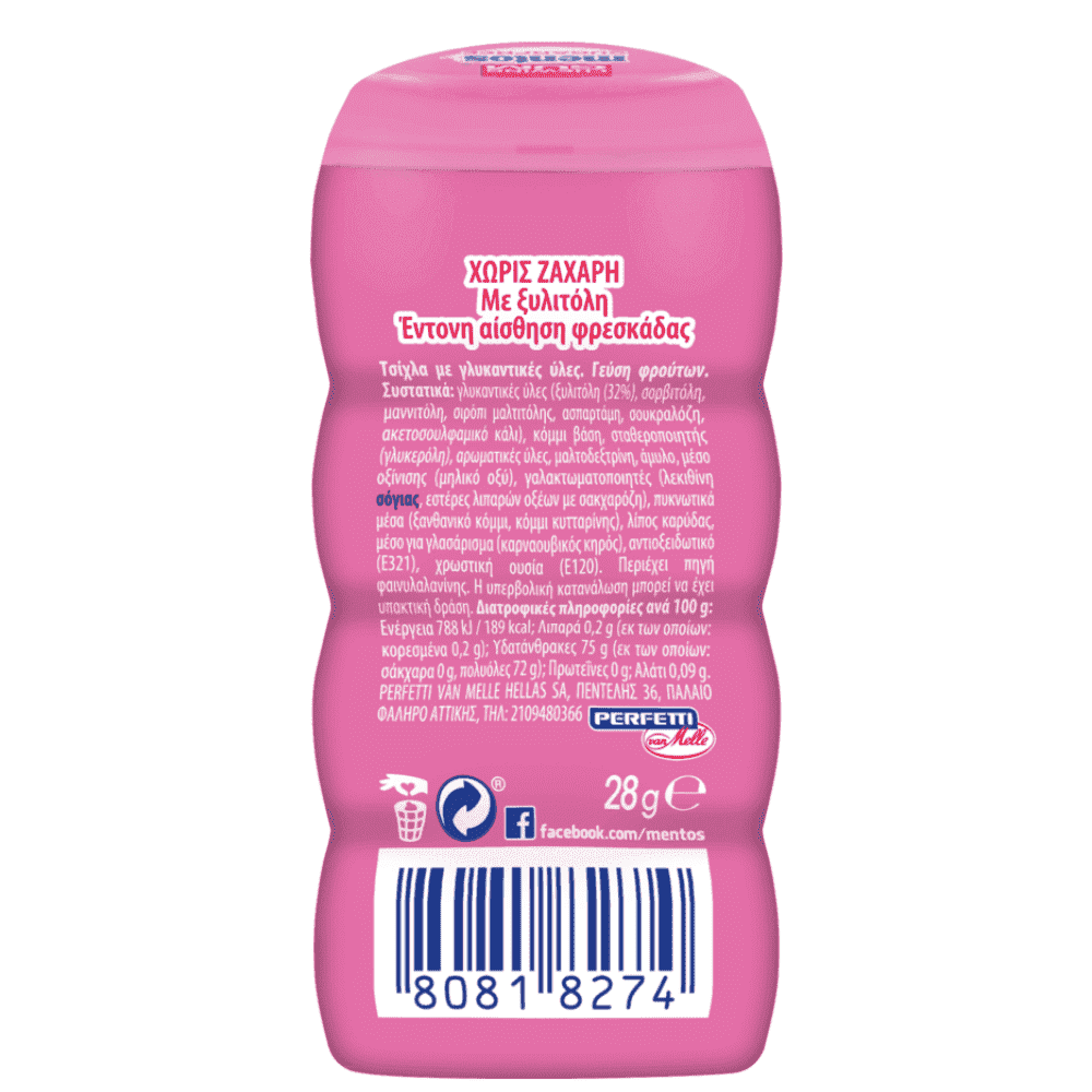 Συστατικά: γλυκαντικές ύλες (ξυλιτόλη, σορβιτόλη, μαννιτόλη, σιρόπι μαλτιτόλης, ασπαρτάμη, σουκραλόζη, ακετοσουλφαμικό κάλι), κόμμι βάση, σταθεροποιητής (γλυκερόλη), μαλτοδεξτρίνη, αρωματικές ύλες, άμυλο, μέσο οξίνισης (μηλικό οξύ), γαλακτωματοποιητές (λεκιθίνη σόγιας, εστέρες λιπαρών οξέων με σακχαρόζη), εκχύλισμα πράσινου τσαγιού (0,1%), πυκνωτικά μέσα (ξανθανικό κόμμι, κόμμι κυτταρίνης), λίπος καρύδας, μέσo για γλασάρισμα (καρναουβικός κηρός), αντιοξειδωτικό (E321), χρωστική ουσία (E120).