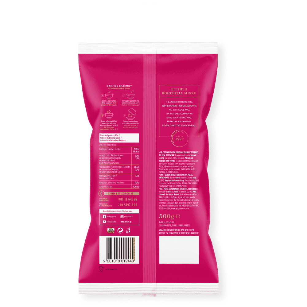 Σιμιγδάλι σκληρού σιταριού, 2 αυγά (σε σκόνη, 2,6%)ανά κιλό.