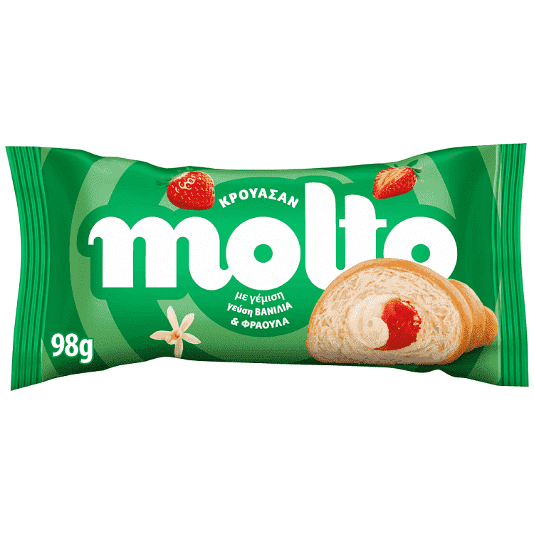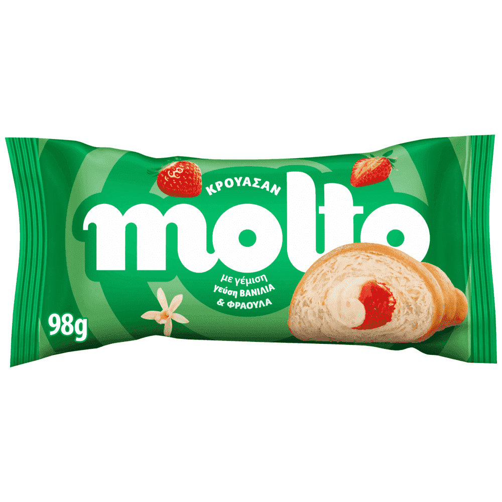 Κρουασάν με γέμιση κρέμα με γεύση βανίλια (16,4%) και γέμιση φράουλα (16,4%). Συστατικά: Αλεύρι ΣΙΤΟΥ, φοινικέλαιο, ζάχαρη, σιρόπι γλυκόζης-φρουκτόζης, νερό, φραόυλες 4%, αποβουτυρωμένο ΓΑΛΑ σε σκόνη, δεξτρόζη, γαλακτωματοποιητές (μονο- και διγλυκερίδια λιπαρών οξέων, πολυγλυκερίδια λιπαρών οξέων, στεατόϋλο-2-γαλακτυλικό νάτριο), γλουτένη ΣΙΤΟΥ, μαγιά, ηλιέλαιο, ιωδιούχο αλάτι, αρωματικές ύλες (περιέχει ΓΑΛΑ), αιθανόλη, κρόκος ΑΥΓΟΥ σε σκόνη, πηκτικό μέσο (πηκτίνες), ρυθμιστές οξύτητας (κιτρικό οξύ, διφωσφορικά άλατα, φωσφορικό οξύ, κιτρικό ασβέστιο), σταθεροποιητής (κόμμι κυτταρίνης), αλεύρι βύνης ΣΙΤΟΥ, βελτιωτικά αλεύρου (L-κυστεΐνη, ασκορβικό οξύ), λακτόζη (από ΓΑΛΑ). Αλλεργιογόνα