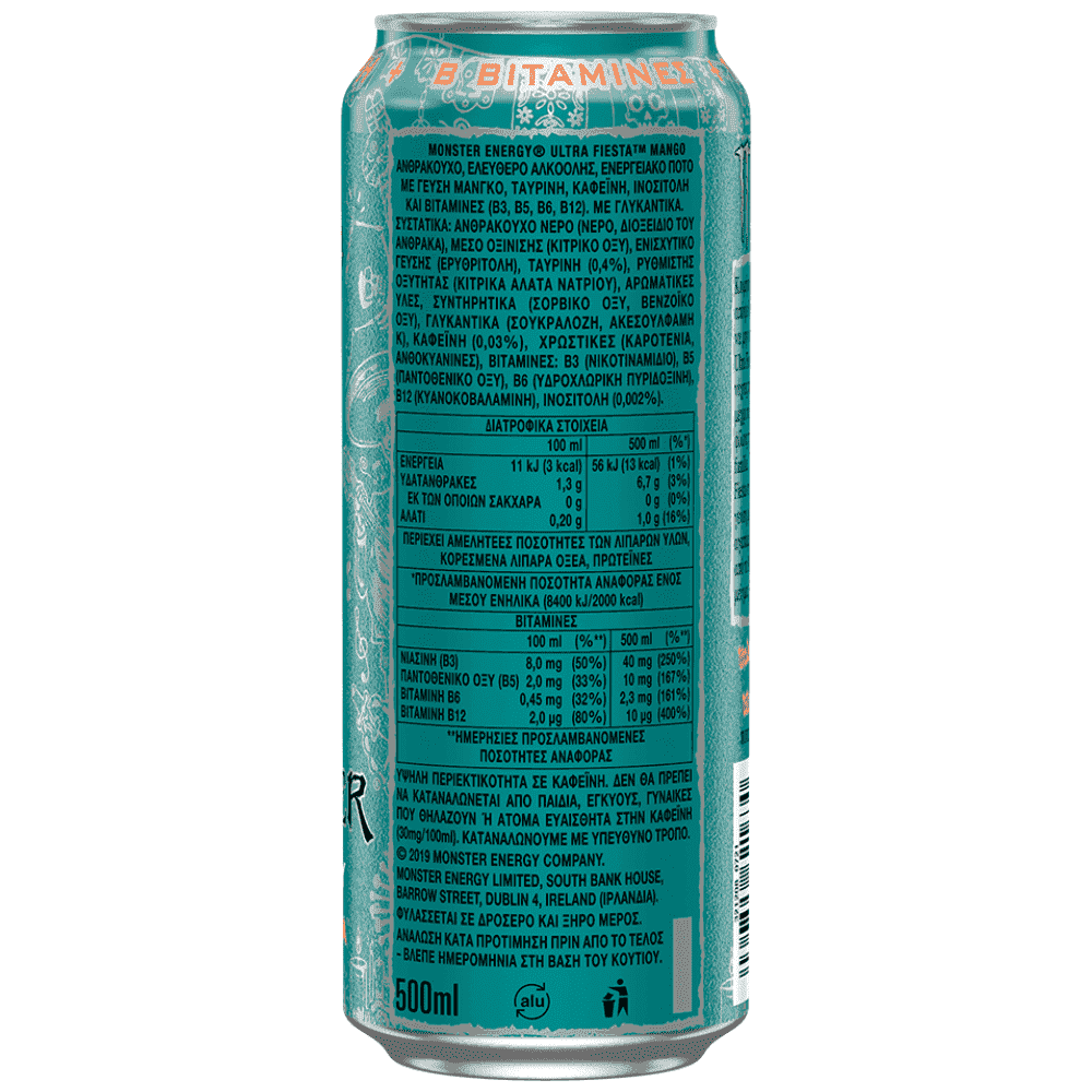 Το Monster Ultra Fiesta Mango 500ml είναι μια μοναδική γευστική εμπειρία που σε ταξιδεύει σε εξωτικά μέρη με κάθε γουλιά. Η ζουμερή και πλούσια γεύση μάνγκο συνδυάζεται αρμονικά με μια δροσερή, ελαφρώς ανθρακούχα υφή, δημιουργώντας ένα απολαυστικό ενεργειακό ποτό χωρίς ζάχαρη. Η ισορροπία της φυσικής γλυκύτητας του μάνγκο και της έντονης φρουτώδους αίσθησης το καθιστά ιδανικό για όσους θέλουν να ξεκινήσουν δυναμικά τη μέρα τους ή να αναζωογονηθούν στη διάρκεια αυτής. Με μηδενικές θερμίδες και υψηλή περιεκτικότητα σε καφεΐνη, προσφέρει την απαραίτητη ώθηση ενέργειας χωρίς να βαραίνει. Η πολύχρωμη και ζωντανή συσκευασία αντικατοπτρίζει τέλεια την αίσθηση γιορτής που φέρνει η γεύση του. Είτε το απολαμβάνεις μόνος είτε το μοιράζεσαι σε μια χαλαρή στιγμή με φίλους, το Monster Ultra Fiesta Mango είναι η απόλυτη επιλογή για όσους αναζητούν κάτι διαφορετικό, γευστικό και γεμάτο ενέργεια. Συνολικά, ένα must-try για τους λάτρεις των τροπικών γεύσεων που θέλουν να συνδυάσουν απόλαυση και ενέργεια.