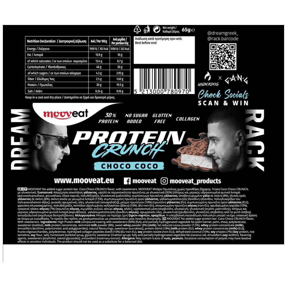Απομίμηση σοκολάτας γάλακτος, υψηλή σε περιεκτικότητα πρωτεΐνης με γλυκαντικά (30%) [πλήρως και μερικώς υδρογονωμένα φυτικά λιπαρά (φοινικοπυρηνέλαιο, φοινικέλαιο, έλαιο καριτέ), πολυδεξτρόζη, γλυκαντικό (μαλτιτόλη), συμπύκνωμα πρωτεΐνης γάλακτος, αποβουτυρωμένο γάλα σε σκόνη (8%), γλυκός ορός γάλακτος σε σκόνη (8%), σκόνη κακάο με μειωμένα λιπαρά (7,5%), συμπυκνωμένη πρωτεΐνη ορού γάλακτος, γαλακτωματοποιητές (λεκιθίνη ηλίανθου, πολυγλυκερίδια του πολυρικινελαϊκού οξέος), φυσικές αρωματικές ύλες, γλυκαντικό (σουκραλόζη)], μείγμα πρωτεϊνών (18%) [πρωτεΐνη γάλακτος (ΕU), συμπυκνωμένη πρωτεΐνη ορού γάλακτος (ΕU)], φρουκτο-ολιγοσακχαρίτης, πολυδεξτρόζη, πεπτίδια υδρολυμένου κολλαγόνου (βόειo) (10%) (ΕU - non-EU), απομονωμένη πρωτεΐνη σόγιας (non-EU), αφυδατωμένη καρύδα (10%), τραγανοί κόκκοι σόγιας (7%) [πρωτεΐνη σόγιας, σιμιγδάλι ρυζιού, αλεύρι σόγιας, αλάτι], υγροσκοπικό μέσο (σορβιτόλη, γλυκερίνη), γλυκαντικό (σιρόπι μαλτιτόλης), πλήρως και μερικώς υδρογονωμένα φυτικά λιπαρά (καρυδέλαιο), γαλακτωματοποιητές (λεκιθίνη σόγιας), αρωματικές ύλες, γλυκαντικά [ερυθριτόλη, γλυκοζίτες στεβιόλης από το φυτό στέβια], αντιοξειδωτικό (εκχύλισμα δεντρολίβανου).Αλλεργιογόνα