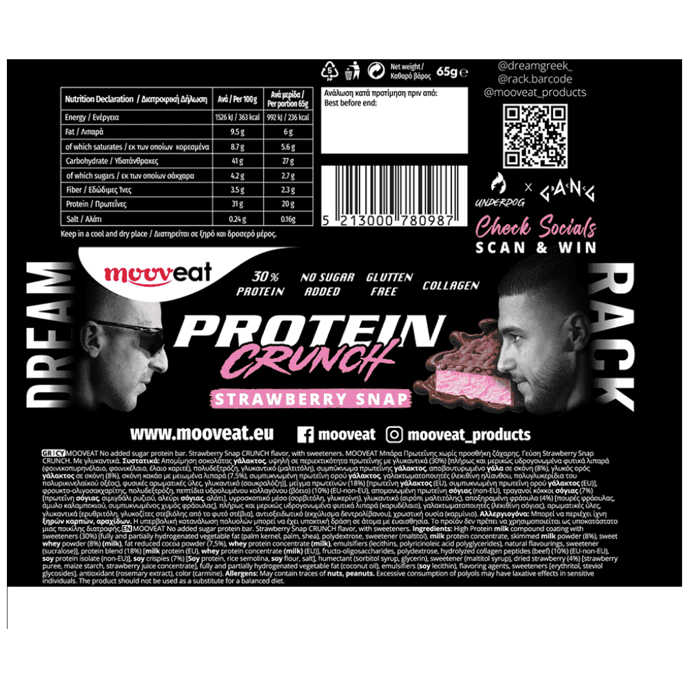 Απομίμηση σοκολάτας γάλακτος, υψηλή σε περιεκτικότητα πρωτεΐνης με γλυκαντικά (30%) [πλήρως και μερικώς υδρογονωμένα φυτικά λιπαρά (φοινικοπυρηνέλαιο, φοινικέλαιο, έλαιο καριτέ), πολυδεξτρόζη, γλυκαντικό (μαλτιτόλη), συμπύκνωμα πρωτεΐνης γάλακτος, αποβουτυρωμένο γάλα σε σκόνη (8%), γλυκός ορός γάλακτος σε σκόνη (8%), σκόνη κακάο με μειωμένα λιπαρά (7,5%), συμπυκνωμένη πρωτεΐνη ορού γάλακτος, γαλακτωματοποιητές (λεκιθίνη ηλίανθου, πολυγλυκερίδια του πολυρικινελαϊκού οξέος), φυσικές αρωματικές ύλες, γλυκαντικό (σουκραλόζη)], μείγμα πρωτεϊνών (18%) [πρωτεΐνη γάλακτος (ΕU), συμπυκνωμένη πρωτεΐνη ορού γάλακτος (ΕU)], φρουκτο-ολιγοσακχαρίτης, πολυδεξτρόζη, πεπτίδια υδρολυμένου κολλαγόνου (βόειo) (10%) (ΕU - non-EU), απομονωμένη πρωτεΐνη σόγιας (non-EU), τραγανοί κόκκοι σόγιας (7%) [πρωτεΐνη σόγιας, σιμιγδάλι ρυζιού, αλεύρι σόγιας, αλάτι], υγροσκοπικό μέσο (σορβιτόλη, γλυκερίνη), γλυκαντικό (σιρόπι μαλτιτόλης), αποξηραμένη φράουλα (4%)[πουρές φράουλας, άμυλο καλαμποκιού, συμπυκνωμένος χυμός φράουλας], πλήρως και μερικώς υδρογονωμένα φυτικά λιπαρά (καρυδέλαιο), γαλακτωματοποιητές (λεκιθίνη σόγιας), αρωματικές ύλες, γλυκαντικά [ερυθριτόλη, γλυκοζίτες στεβιόλης από το φυτό στέβια], αντιοξειδωτικό (εκχύλισμα δεντρολίβανου), χρωστική ουσία (καρμίνιο).Αλλεργιογόνα
