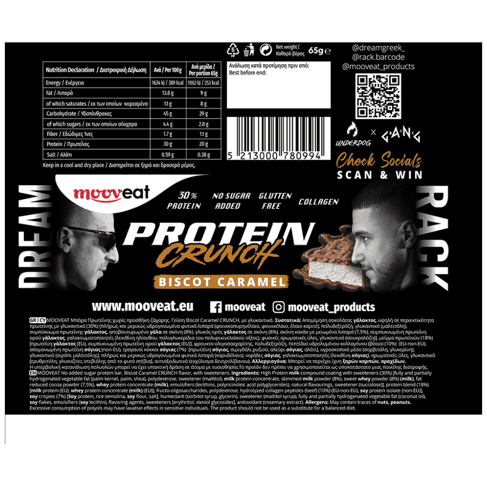 Απομίμηση σοκολάτας γάλακτος, υψηλή σε περιεκτικότητα πρωτεΐνης με γλυκαντικά (30%) [πλήρως και μερικώς υδρογονωμένα φυτικά λιπαρά (φοινικοπυρηνέλαιο, φοινικέλαιο, έλαιο καριτέ), πολυδεξτρόζη, γλυκαντικό (μαλτιτόλη), συμπύκνωμα πρωτεΐνης γάλακτος, αποβουτυρωμένο γάλα σε σκόνη (8%), γλυκός ορός γάλακτος σε σκόνη (8%), σκόνη κακάο με μειωμένα λιπαρά (7,5%), συμπυκνωμένη πρωτεΐνη ορού γάλακτος, γαλακτωματοποιητές (λεκιθίνη ηλίανθου, πολυγλυκερίδια του πολυρικινελαϊκού οξέος), φυσικές αρωματικές ύλες, γλυκαντικό (σουκραλόζη)], μείγμα πρωτεϊνών (18%) [πρωτεΐνη γάλακτος (ΕU), συμπυκνωμένη πρωτεΐνη ορού γάλακτος (ΕU)], φρουκτο-ολιγοσακχαρίτης, πολυδεξτρόζη, πεπτίδια υδρολυμένου κολλαγόνου (βόειo) (10%) (ΕU - non-EU), απομονωμένη πρωτεΐνη σόγιας (non-EU), τραγανοί κόκκοι σόγιας (7%) [πρωτεΐνη σόγιας, σιμιγδάλι ρυζιού, αλεύρι σόγιας, αλάτι], υγροσκοπικό μέσο (σορβιτόλη, γλυκερίνη), γλυκαντικό (σιρόπι μαλτιτόλης), πλήρως και μερικώς υδρογονωμένα φυτικά λιπαρά (καρυδέλαιο), νιφάδες σόγιας, γαλακτωματοποιητές (λεκιθίνη σόγιας), αρωματικές ύλες, γλυκαντικά [ερυθριτόλη, γλυκοζίτες στεβιόλης από το φυτό στέβια], αντιοξειδωτικό (εκχύλισμα δεντρολίβανου)Αλλεργιογόνα