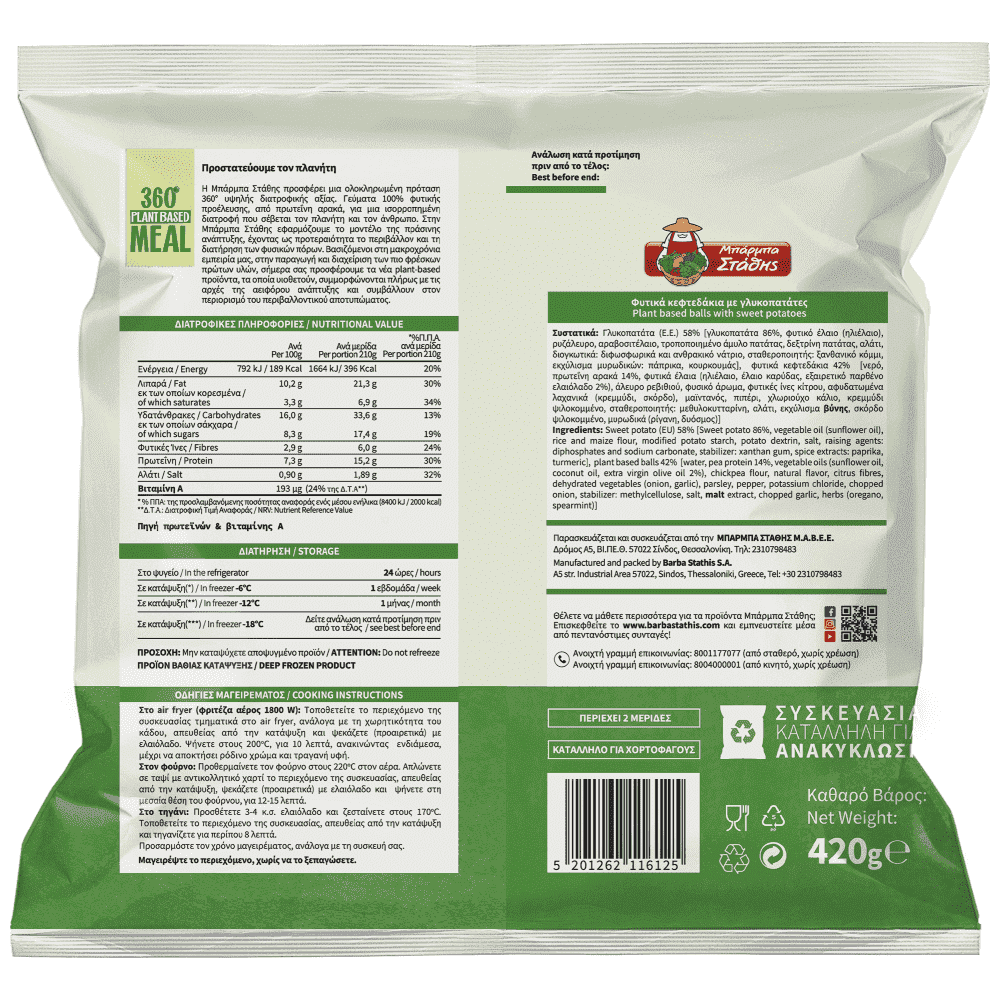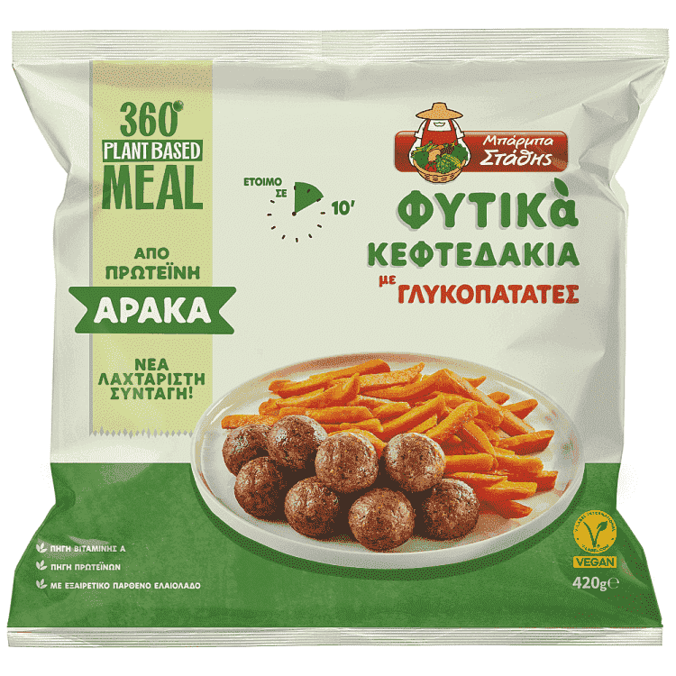 Γλυκοπατάτα (Ε.Ε.) 58% { γλυκοπατάτα 86%, φυτικό έλαιο (ηλιέλαιο), ρυζάλευρο, αραβοσιτέλαιο, τροποποιημένο άμυλο πατάτας, δεξτρίνη πατάτας, αλάτι, διογκωτικά: διφωσφωρικά και ανθρακικό νάτριο, σταθεροποιητής: ξανθανικό κόμμι, εκχύλισμα μυρωδικών: πάπρικα, κουρκουμάς}, φυτικά κεφτεδάκια 42% { νερό, πρωτεϊνη αρακά 14%, φυτικά έλαια, (ηλιέλαιο, έλαιο καρύδας, εξαιρετικό παρθένο ελαιόλαδο 2%), άλευρο ρεβιθιού, φυσικό άρωμα, φυτικές ίνες κίτρου, αφυδατωμένα λαχανικά (κρεμμύδι, σκόρδο), μαϊντανός, πιπέρι, χλωριούχο κάλιο,κρεμμύδι ψιλοκομμένο, σταθεροποιητής: μεθυλοκκυταρίνη, αλάτι, εκχύλισμα βύνης, σκόρδο ψιλοκομμένο, ,υρωδικά (ρίγανη, δυόσμος)}Αλλεργιογόνα