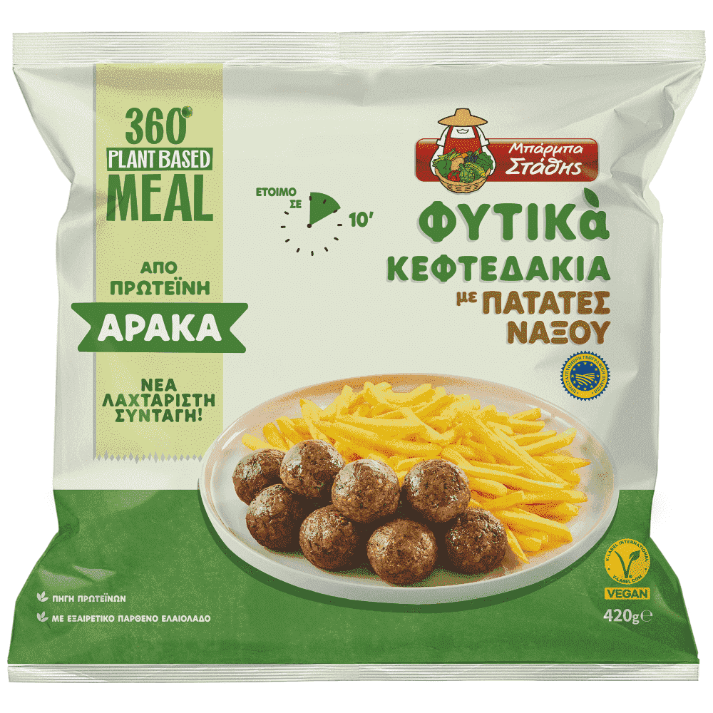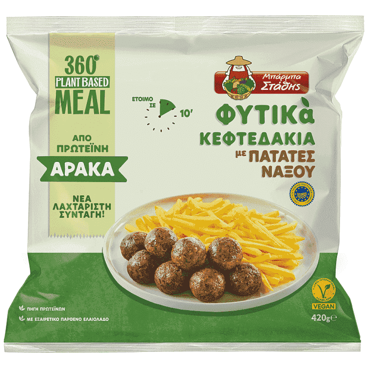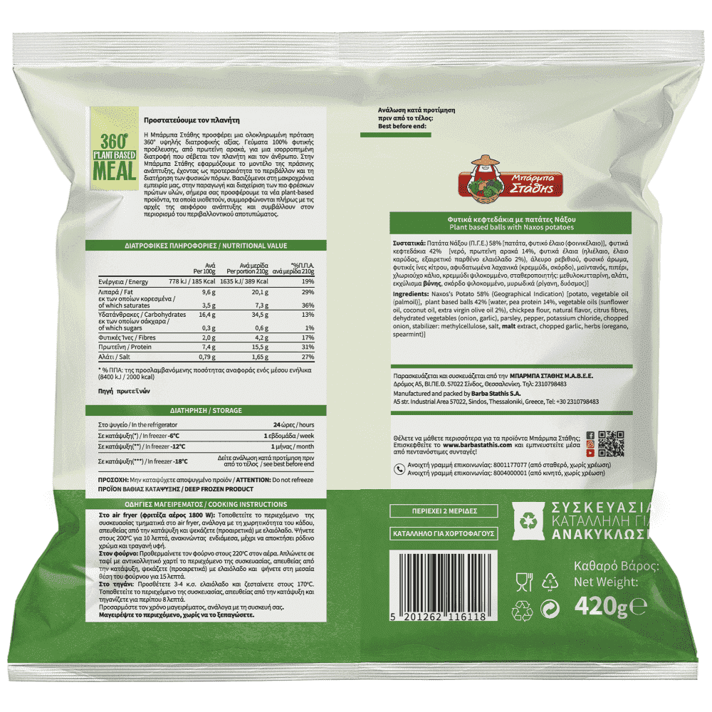 Πατάτα Νάξου (Π.Γ.Ε.) 58% (πατάτα, φυτικό έλαιο (φοινικέλαιο)), φυτικά κεφτεδάκια 42% { νερό, πρωτεϊνη αρακά 14%, φυτικά έλαια (ηλιέλαιο, έλαιο καρύδας, εξαιρετικά παρθένο ελαιόλαδο 2%), άλευρο ρεβιθιού, φυσικό άρωμα, φυτικές ίνες κίτρου, αφυδατωμένα λαχανικά (κρεμμύδι, σκόρδο), μαϊντανός, πιπέρι, χλωριούχο κάλιο, κρεμμύδι, σταθεροποιητής: μεθυλοκυτταρίνη, αλάτι, εκχύλισμα βύνης, σκόρδο ψιλοκομμένο, μυρωδικά (ρίγανη, δυόσμος)}Αλλεργιογόνα