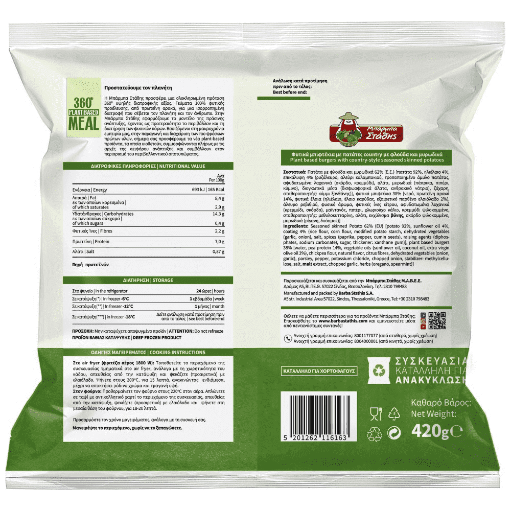 Πατάτα με φλούδα και μυρωδικά 62% (Ε.Ε) [πατάτα 92%, ηλιέλαιο 4%, επικάλυψη 4% (ρυζάλευρο, αλεύρι καλαμποκιού, τροποποιημένο άμυλο πατάτας, αφυδατωμένα λαχανικά (σκόρδο, κρεμμύδι), αλάτι, μυρωδικά (πάπρικα, πιπέρι,κύμινο), διογκωτικά μέσα (δισφωσφορικά άλατα, ανθρακικό νάτριο), ζάχαρη, σταθεροποιητής: κόμμι ξανθάνης)], φυτικά μπιφτέκια 38% [νερό, πρωτεΐνη αρακά 14%, φυτικά έλαια (ηλιέλαιο, έλαιο καρύδας, εξαιρετικό παρθένο ελαιόλαδο 2%), άλευρο ρεβιθιού, φυσικό άρωμα, φυτικές ίνες κίτρου, αφυδατωμένα λαχανικά (κρεμμύδι, σκόρδο), μαϊντανός, πιπέρι, χλωριούχο κάλιο, κρεμμύδι ψιλοκομμένο, σταθεροποιητής: μεθυλοκυτταρίνη, αλάτι, εκχύλισμα βύνης, σκόρδο ψιλοκομμένο, μυρωδικά (ρίγανη, δυόσμος)]Αλλεργιογόνα