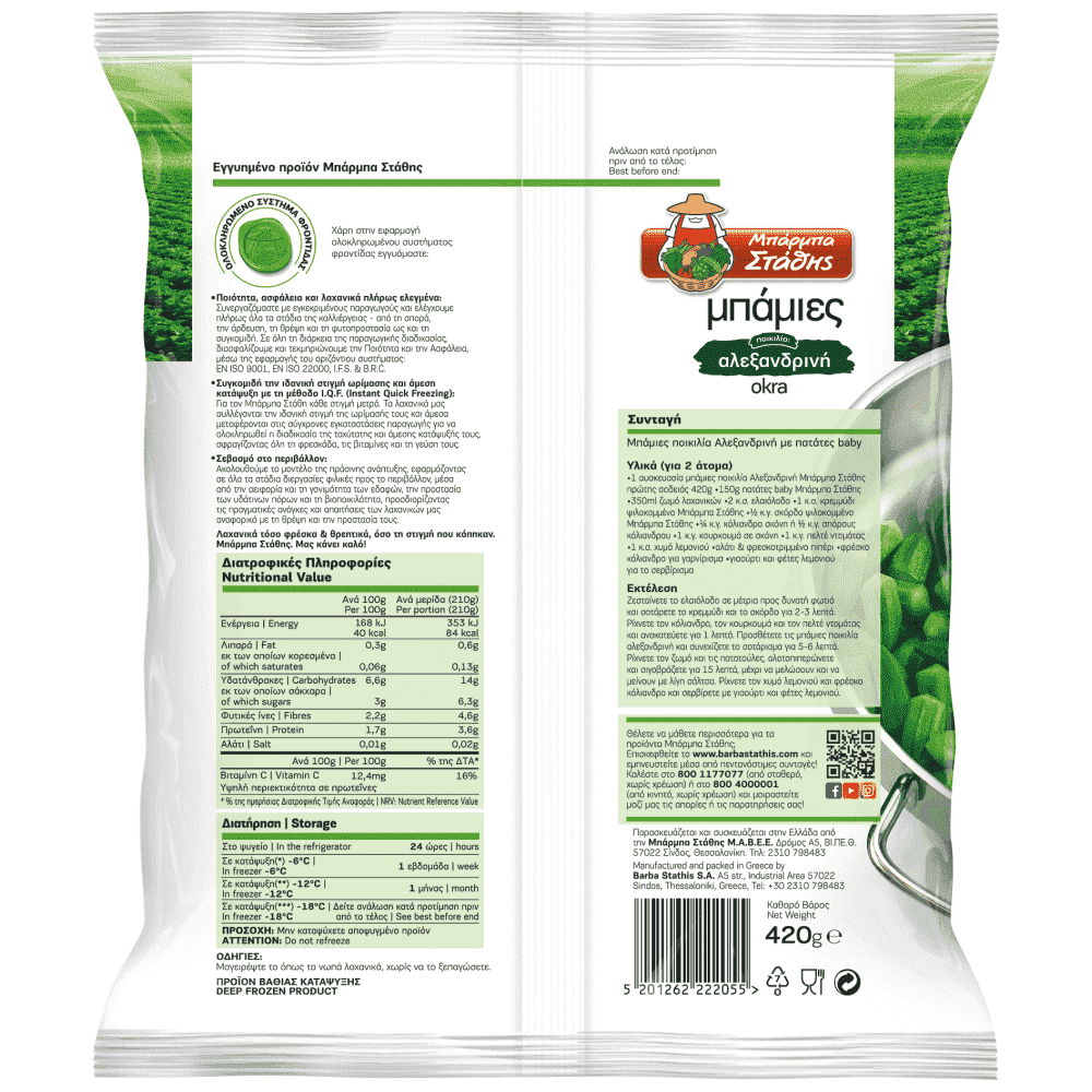 Παρασκευάζεται και συσκευάζεται στην Ελλάδα από την Μπάρμπα Στάθης Μ.Α.Β.Ε.Ε., Δρόμος Α5, ΒΙ.ΠΕ.Θ. 57022, Σίνδος, Θεσσαλονίκη, Τηλ 2310 798483, 800 1177077(από σταθερό, χωρίς χρέωση) ή 800 4000001 (από κινητό, χωρίς χρέωση)