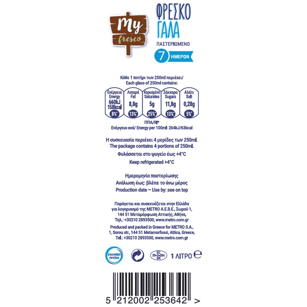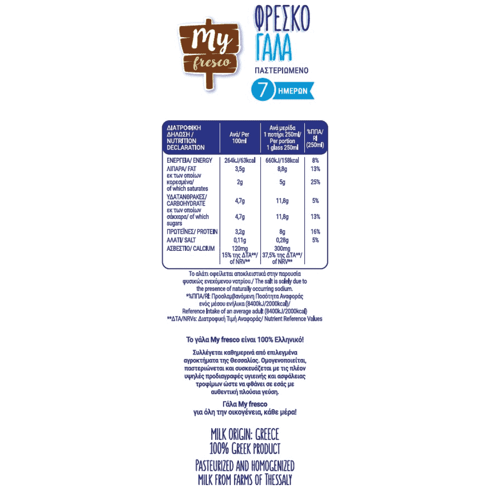 Απολαύστε το 100% ελληνικό γάλα My fresco, πλήρες ή ελαφρύ, κάθε μέρα! Το γάλα My fresco συλλέγεται καθημερινά από επιλεγμένα αγροκτήματα της Θεσσαλίας. Ομογενοποιείται, παστεριώνεται και συσκευάζεται με τις πλέον υψηλές προδιαγραφές υγιεινής και ασφάλειας τροφίμων ώστε να φθάνει σε εσάς με αυθεντική πλούσια γεύση.
