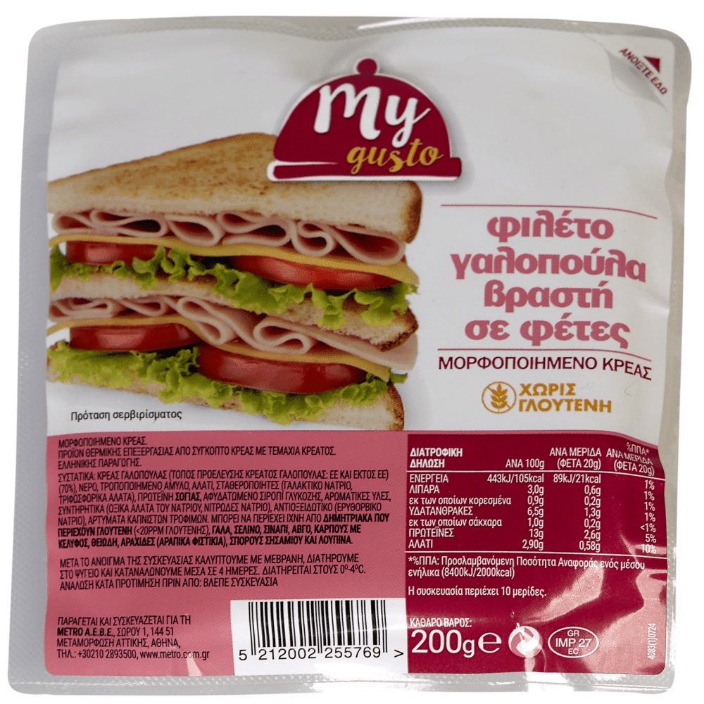 Κρέας γαλοπούλας (τόπος προέλευσης κρέατος γαλοπούλας: ΕΕ και εκτός ΕΕ) (70%), νερό, τροποποιημένο άμυλο, αλάτι, σταθεροποιητές (γαλακτικό νάτριο, τριφωσφορικά