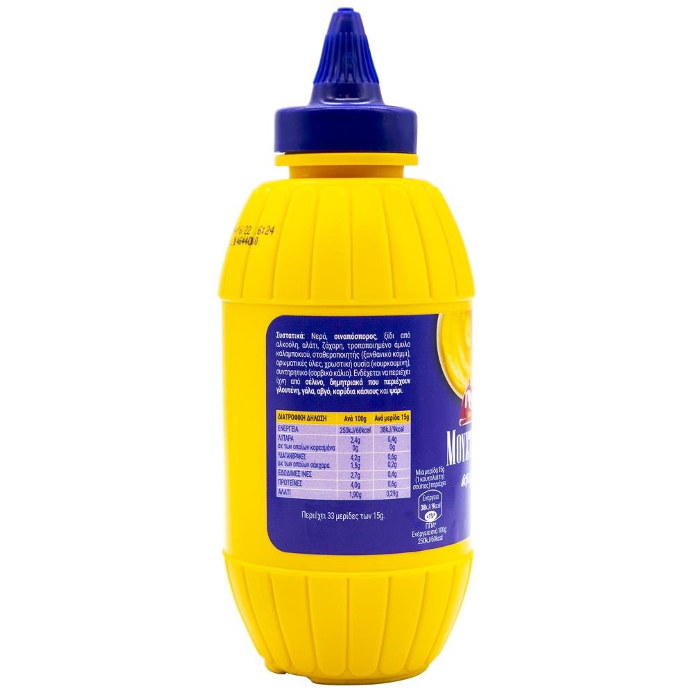 Νερό, σιναπόσπορος, ξίδι από αλκοόλη, αλάτι, ζάχαρη, τροποποιημένο άμυλο καλαμποκιού, σταθεροποιητής (ξανθανικό κόμμι), αρωματικές ύλες, χρωστική ουσία (κουρκουμίνη), συντηρητικό (σορβικό κάλιο). Ενδέχεται να περιέχει ίχνη από Σέλινο, γλουτένη, λακτόζη, αβγό, κάσιους & ψάρι.