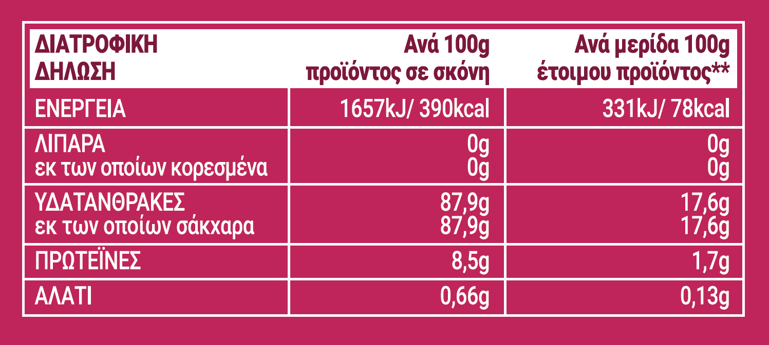 | Aνά 100g προϊόντος σε σκόνη | Ανά μερίδα 100g έτοιμου προϊόντος | % ΠΠΑ ανά 100g έτοιμου προϊόντος | |