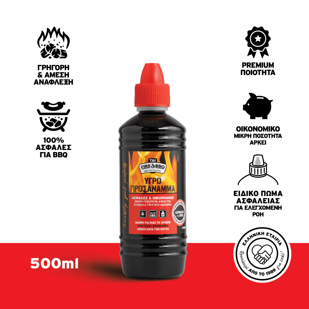 Το υγρό προσάναμμα My Lighting Stories από την ΤΑΙ προσφέρει πολλά πλεονεκτήματα όταν πρόκειται για το άναμμα φωτιάς για ψησταριές, τζάκια ή υπαίθριο bbQ. Ευκολία στη χρήση: Έχει σχεδιαστεί για να κάνη τη διαδικασία εκκίνησης της φωτιάς γρήγορη και απλή. Διατίθενται σε μπουκάλια συμπίεσης επιτρέποντάς σας να εφαρμόσετε εύκολα το υγρό στην επιθυμητή περιοχή. Ταχεία ανάφλεξη: Το υγρό προσάναμμα ανάβει εύκολα και με ασφάλεια. Αυτό σημαίνει ότι μπορείτε να ξεκινήσετε τη φωτιά σας πιο γρήγορα σε σύγκριση με εναλλακτικές μεθόδους, όπως η χρήση χαρτιού, ανάφλεξης ή σπίρτων μόνο. Ομοιόμορφη κατανομή: Η υγρή μορφή του σας επιτρέπει να κατανέμετε ομοιόμορφα εξασφαλίζοντας σταθερή ανάφλεξη. Αυτό μπορεί να είναι ιδιαίτερα χρήσιμο όταν ανάβετε κάρβουνο ή ξύλα για ψήσιμο, καθώς βοηθά στην επίτευξη ομοιόμορφης καύσης και κατανομής θερμότητας.