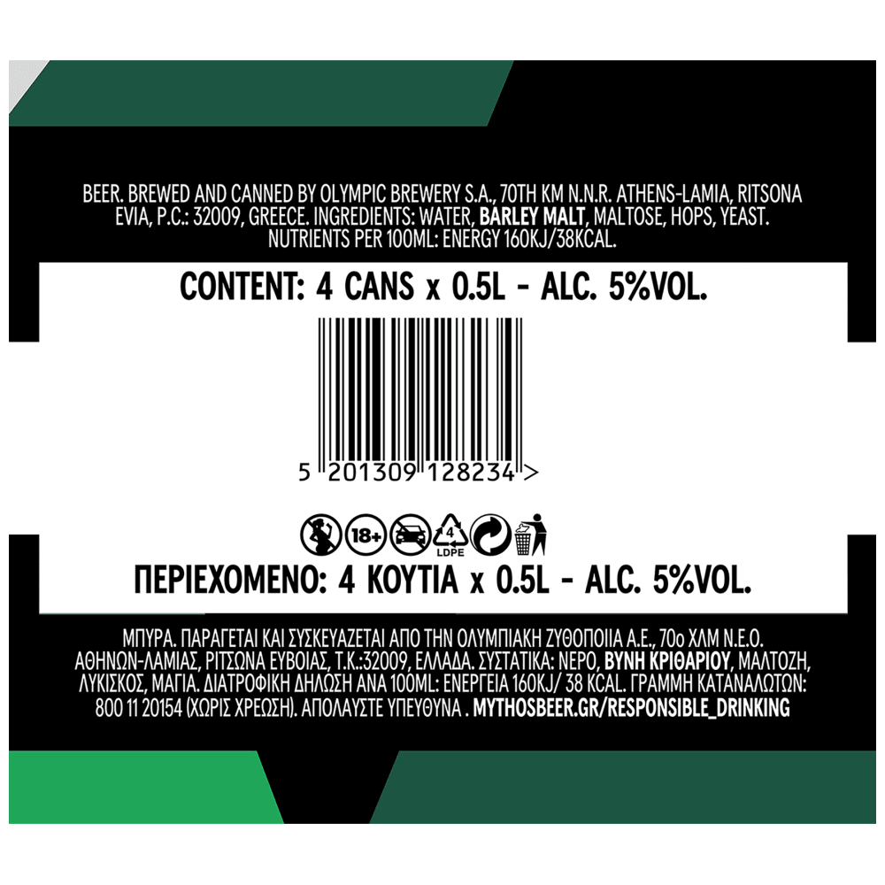 "Mπύρα Mythos, τύπου Lager με αλκοολικό βαθμό 5,0%. Η σύγχρονη ελληνική Lager Mπύρα Mythos με πλούσιο αφρό, λαμπερό ξανθό χρώμα και ευχάριστη δροσιστική γεύση. Νότες λυκίσκου συνδυάζονται με μια ελαφρά γλυκύτητα και μια μακράς διάρκειας επίγευση. Με το καπάκι για εύκολο άνοιγμα, αποτελεί εγγύηση απόλαυσης για κάθε στιγμή και ιδανική επιλογή για το bar, το beach bar και την πλατεία!