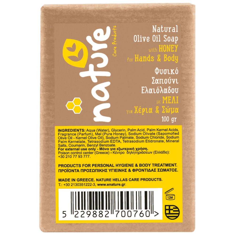 Το φυσικό-φυτικό σαπούνι ελαιόλαδου με μέλι NATURE είναι κατάλληλο για τα χέρια και το σώμα. Είναι ιδανικό για καθημερινή χρήση, βοηθά στη διατήρηση της φυσικής υγρασίας της επιδερμίδας, ηρεμεί & αφήνει λείο το δέρμα. O συνδυασμός ελαιόλαδου και του μελιού προστατεύει, τονώνει και καθαρίζει απαλά την επιδερμίδα. Κατάλληλο για όλους τους τύπους δέρματος.