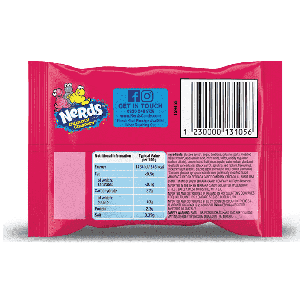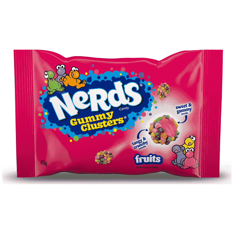 Απελευθέρωσε τις αισθήσεις σου. Τα NERDS Gummy Clusters συνδυάζουν έναν μαλακό, μαστιχωτό πυρήνα ζελεδάκι με φρουτένια γεύση και μια πολύχρωμη, τραγανή επικάλυψη από καραμέλες NERDS. Κάθε μπουκιά προσφέρει μια έκρηξη γεύσης, έναν απολαυστικά μαστιχωτό πυρήνα και εκείνη την εμβληματική τραγανότητα των NERDS!