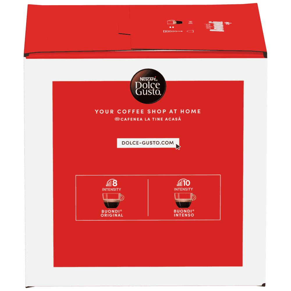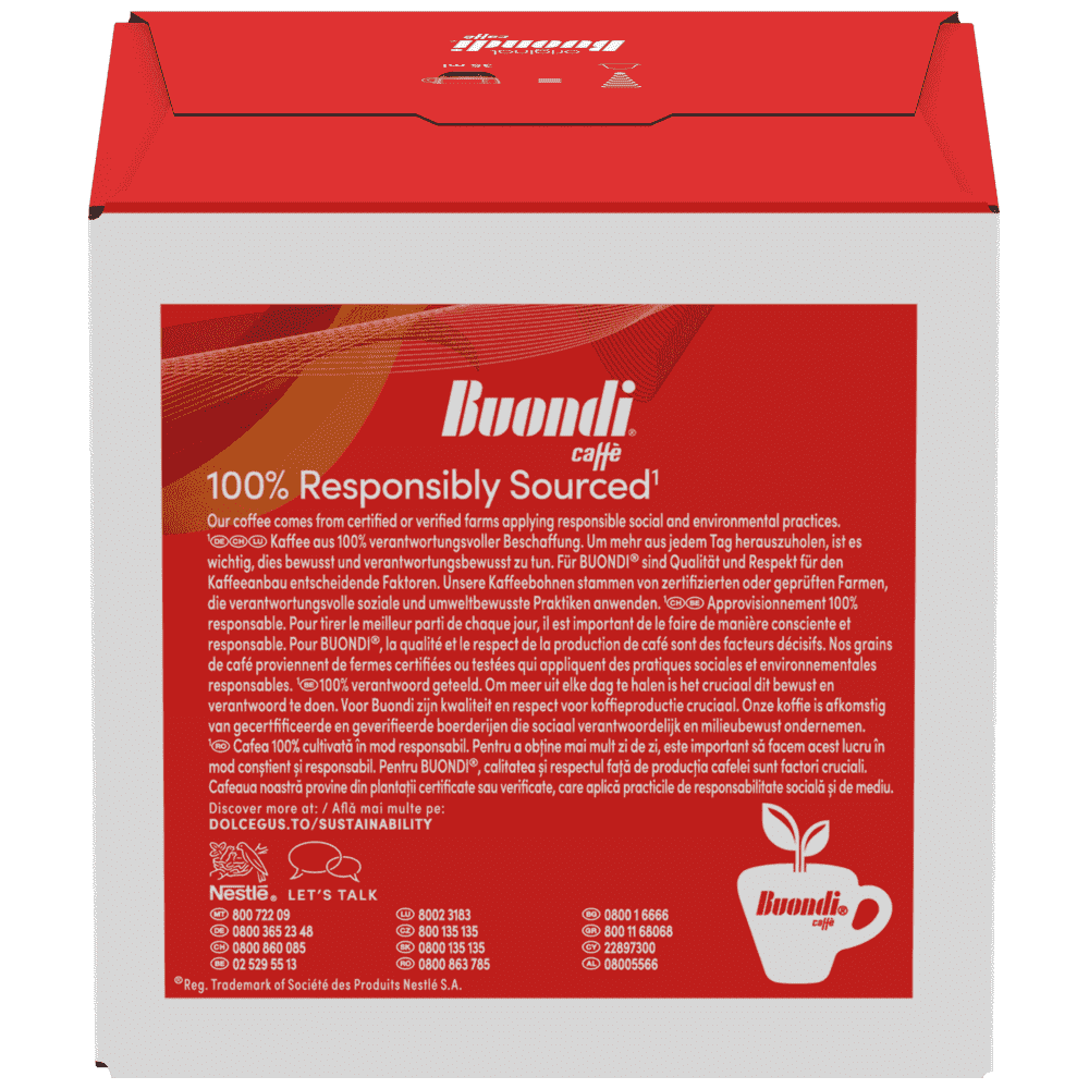 Όλο το ταπεραμέντο του νότου σε ένα φλιτζάνι. Ο NESCAFE® Dolce Gusto® Espresso Buondi με το ξεχωριστό άρωμα του, αγγίζει την ιταλική κουλτούρα συνδυάζοντας εκλεκτούς κόκκους Arabica και Robusta. Με ελαφριές νότες πιπεριού δημιουργεί μια εξωτική γεύση και βελούδινη πλούσια κρέμα. Η έντασή του είναι ιδανική για να συνοδεύσει από ένα επιδόρπιο μέχρι ένα μεσημεριανό γεύμα, μετατρέποντας κάθε κάψουλα espresso σε μια ξεχωριστή στιγμή απόλαυσης. Χάρη στην πατενταρισμένη τεχνολογία της κάψουλας, ο espresso παρασκευάζεται με την τέλεια πίεση, ξεδιπλώνοντας όλο το άρωμά του στο φλιτζάνι σας.