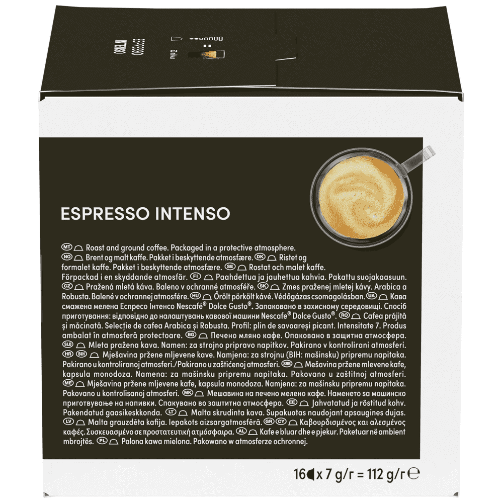 Ο NESCAFE® Dolce Gusto® Espresso Intenso, είναι ένας μέτρια καβουρδισμένος καφές, εντάσεως 7. Προκειμένου να σχεδιάσουν αυτήν τη μοναδική αρωματική υπογραφή, με έντονα αρώματα και απαλό σώμα, οι δημιουργοί καφέ που συνεργάζονται με εμάς συνδύασαν και καβούρδισαν προσεχτικά φρουτώδεις κόκκους καφέ της ποικιλίας Arabica από τη Νότιο Αμερική (Κολομβία) μαζί με κόκκους καφέ γεμάτους σώμα της ποικιλίας Robusta από την Ασία (Βιετνάμ). Απόλαυσε τις νότες των καλοκαιρινών κόκκινων μούρων με τις διακριτικές πικάντικες αντιθέσεις ροζ πιπεριού σε έναν απολαυστικό συνδυασμό που θα σε ενθουσιάσει!