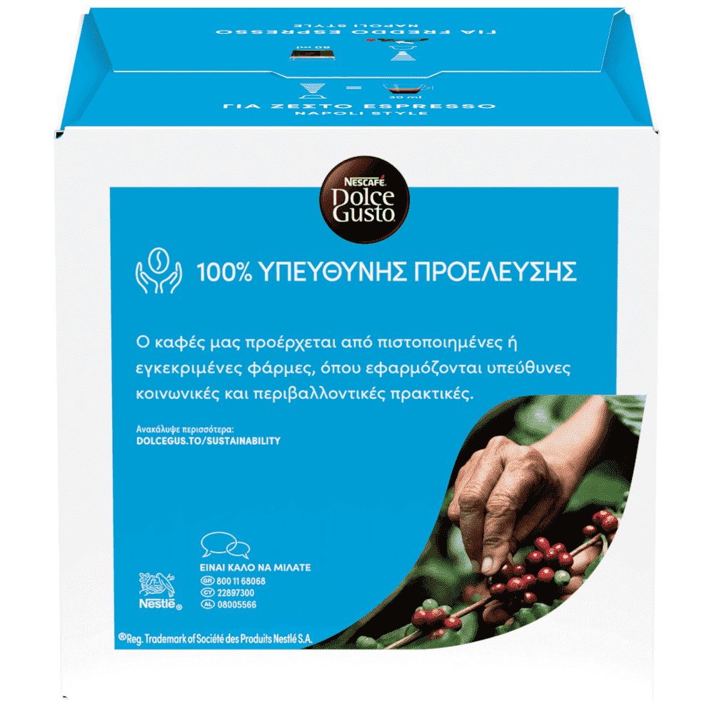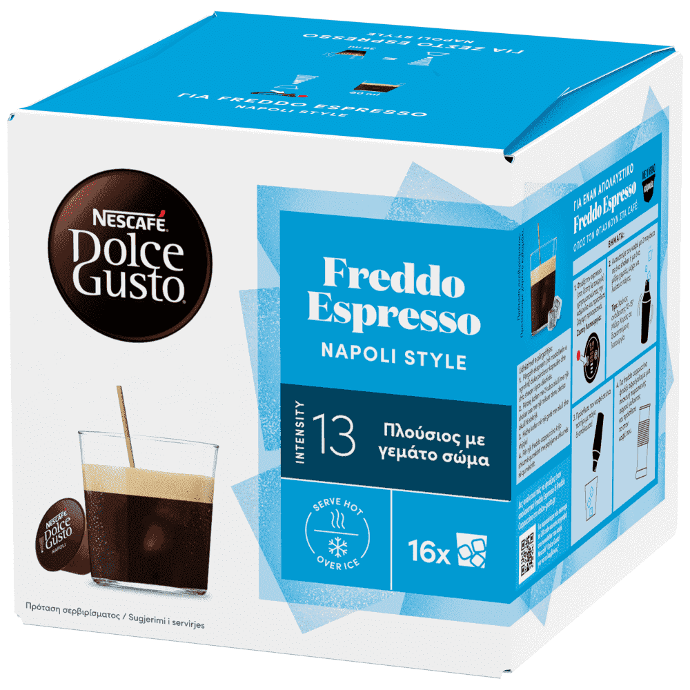 Εμπνευσμένος από το πάθος των Ναπολιτάνων για καφέ και την αγάπη των Ελλήνων για Freddo Espresso, ο καφές NESCAFE? DOLCE GUSTO? Freddo Espresso Napoli style σχεδιάστηκε ώστε από την πρώτη γουλιά να ενθουσιάσει και να κερδίσει του λάτρεις του Freddo Espresso. Ταξίδεψε στην απόλαυση, παρέα με το μοναδικό του χαρακτήρα και το έντονο καβούρδισμά του. Ένα ιδιαίτερα έντονο χαρμάνι (ένταση 13) από ποικιλίες καφέ που ευδοκιμούν στην Κολομβία, τη Βραζιλία και την Ουγκάντα.