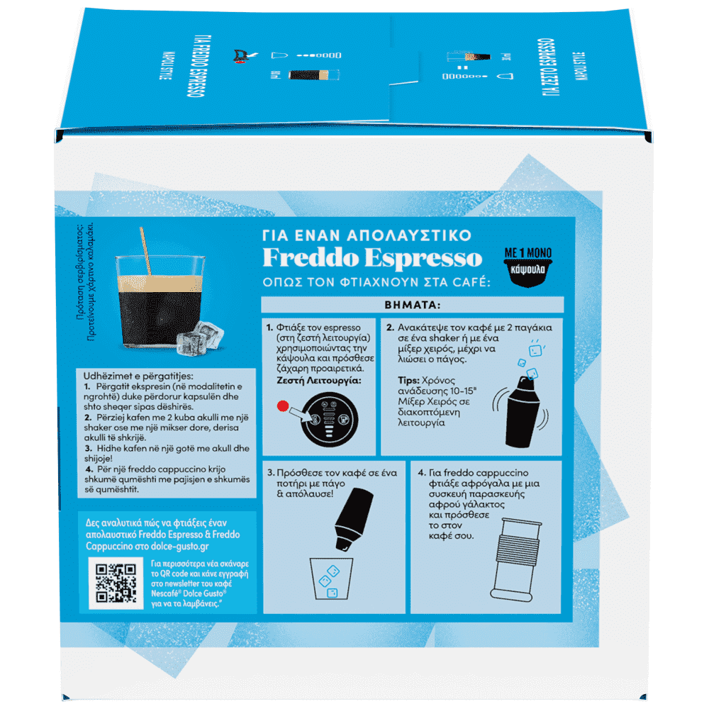 Απολαυστικός Freddo Espresso σε 4 βήματα: 1. Φτιάχνουμε τον espresso στη ζεστή λειτουργία της μηχανής (αρκεί μία μόνο κάψουλα). Προσθέτουμε ζάχαρη αν το επιθυμούμε. 2. Ανακατεύουμε τον καφέ με 2 παγάκια σε ένα shaker ή με mixer χειρός, μέχρι να λιώσουν τα παγάκια. 3. Μεταφέρουμε τον καφέ σε ένα ποτήρι με πάγο και απολαμβάνουμε! 4. Για Freddo Cappuccino, ετοιμάζουμε αφρόγαλα με τη συσκευή FREDDOTORE και το προσθέτουμε στον καφέ.