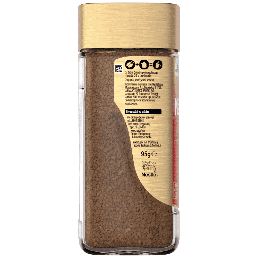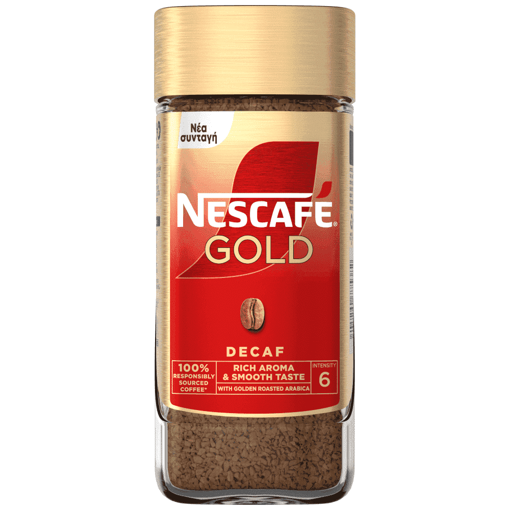 Ανακάλυψε τη συνταγή NESCAFE® GOLD DECAF και γεύσου τη διαφορά! Ένα εκλεκτό χαρμάνι από κόκκους Arabica και Robusta και αποκαφεϊνοποίηση με απόλυτα φυσικό τρόπο (με νερό). Αυτός ο καφές NESCAFE® είναι ένας καφές 100% υπεύθυνης προέλευσης, που στηρίζεις του καλιεργητές για την βελτίωση της γης τους και της διαβίωσης του. *Nescafe Gold στην Ευρώπη. Μάθετε περισσότερα στο www.nescafe.gr Στιγμιαίος καφές χωρίς καφεΐνη. Η αφαίρεση της καφεΐνης γίνεται με 100% φυσικό τρόπο, με νερό. Ένα εκλεκτό χαρμάνι από κόκκους Arabica και Robusta με προσθήκη 10 φορές πιο λεπτά αλεσμένων κόκκων Arabica για ακόμα πιο πλούσια γεύση και έντονο άρωμα.