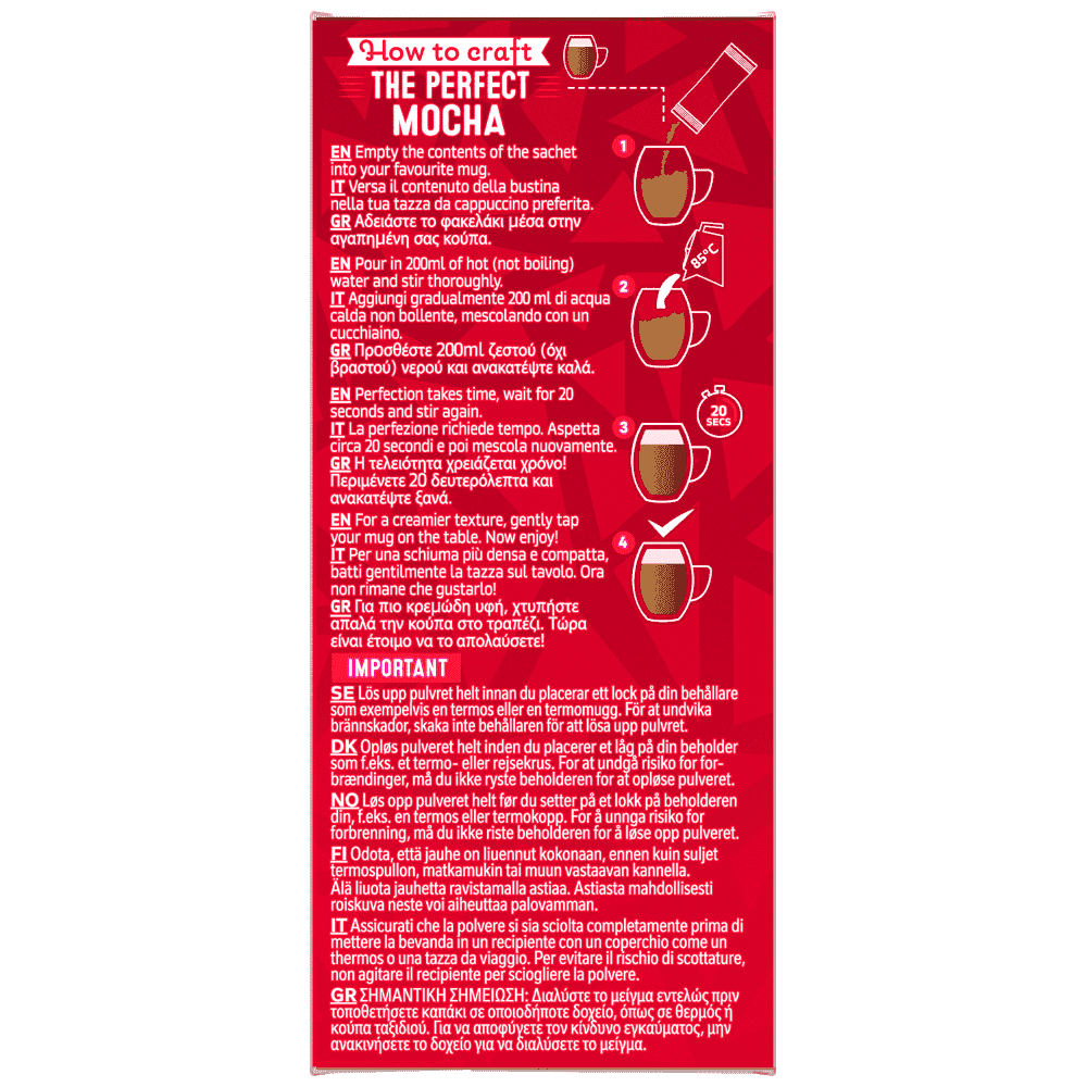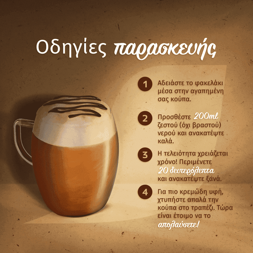 1. Αδειάστε το φακελάκι μέσα στην αγαπημένη σας κούπα. 2. Πρoσθέστε 200ml ζεστού (όχι βραστού) νερού και ανακατέψτε καλά. 3. Η τελειότητα χρειάζεται χρόνο! Περιμενέτε 20 δευτερόλεπτα και ανακατέψτε ξανά. 4. Για περισσότερο κρεμώδη υφή, χτυπήστε απαλά την κούπα στο τραπέζι. Τώρα είναι έτοιμο να το απολαύσετε!