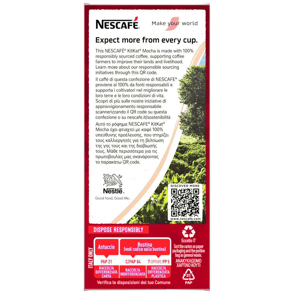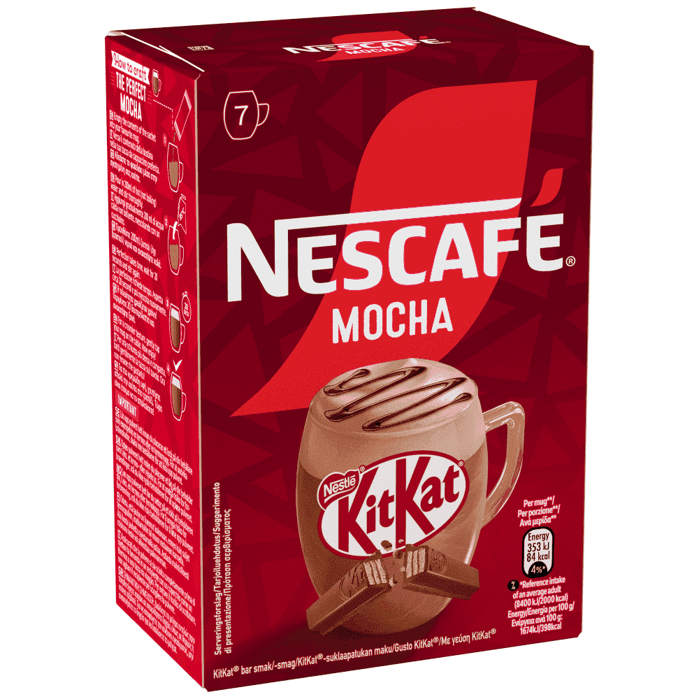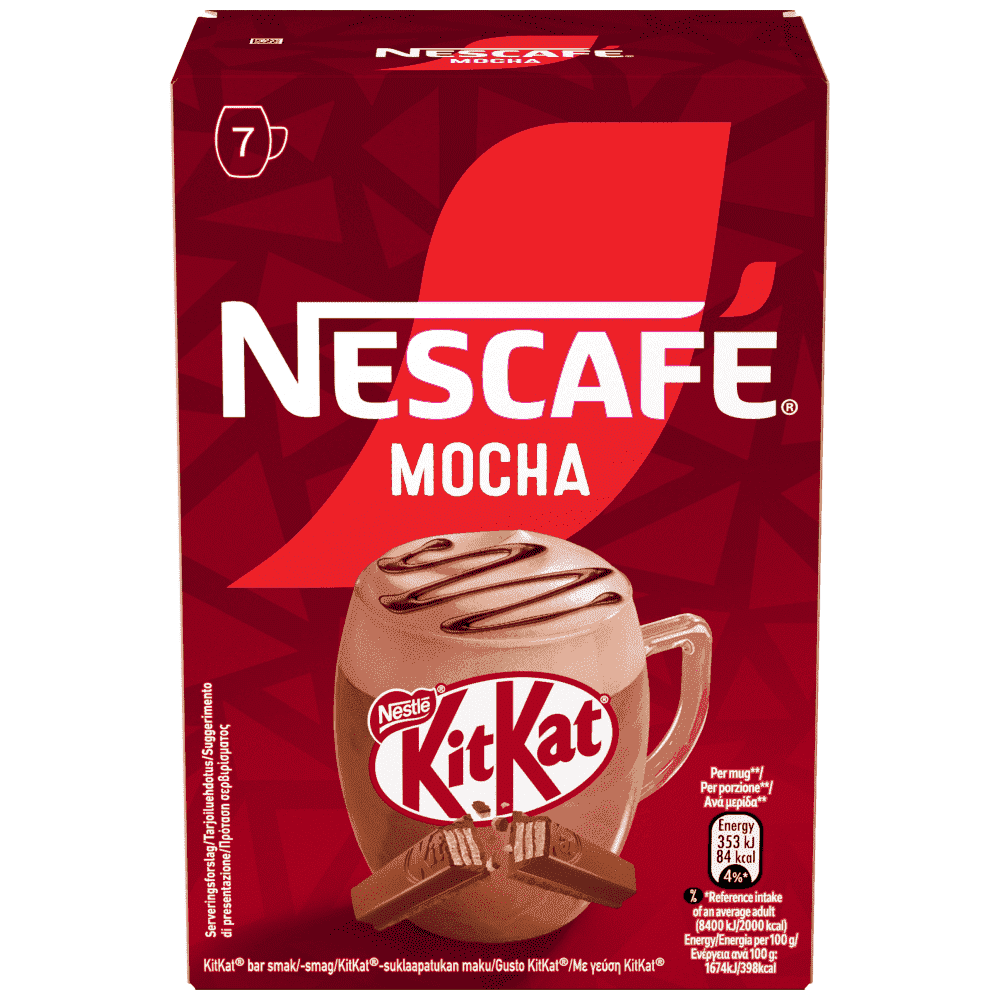 Ανακαλύψτε το νέο NESCAFE KitKat Mocha, εμπνευσμένο από το εμβληματικό KitKat που αγαπάτε. Η τέλεια ισορροπία εκλεκτών κόκκων καφέ, σε συνδυασμό με γευστικό αφρόγαλα και σοκολατένια γεύση γκοφρέτας. Ένα ακαταμάχητα βελούδινο και πλούσιο γευστικό αποτέλεσμα για κάθε στιγμή της ημέρας. Μείγμα για στιγμιαίο ρόφημα με καφέ και κακάο, με γεύση KitKat.
