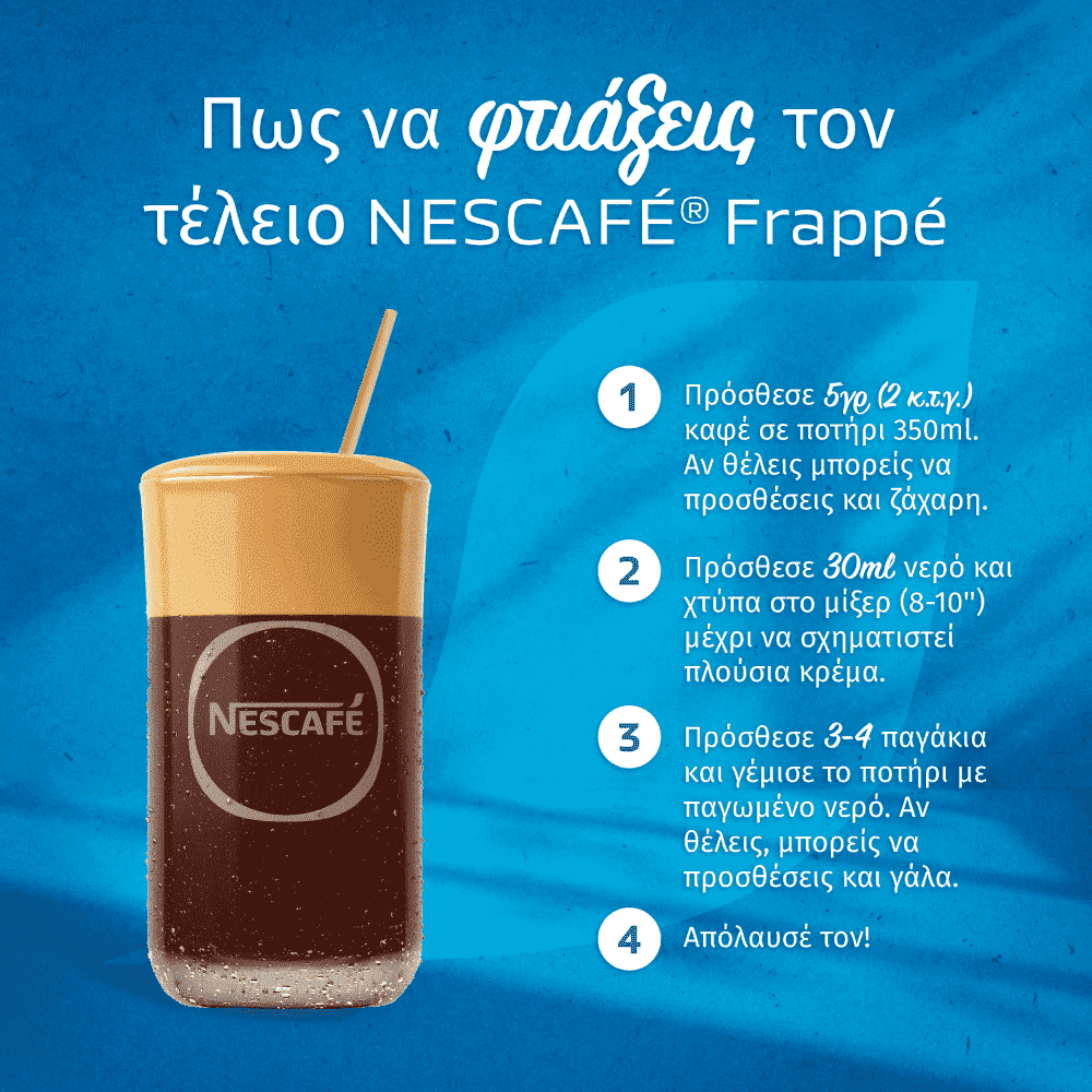 ΓΙΑ ΖΕΣΤΟ: 2 (5γρ) κουταλάκι του γλυκού Nescafe, προεραιτικά ζάχαρη (για να φτιάξουμε μέτριο καφέ χρειαζόμαστε ποσότητα ζάχαρης ίδια με του καφέ), 1 κουταλάκι του γλυκού ζεστό νερό. Αν θέλουμε γάλα το προσθέτουμε στο τέλος. ΓΙΑ ΚΡΥΟ: 2 κουταλάκια γλυκού καφέ, προεραιτικά ζάχαρη (για να φτιάξουμε μέτριο καφέ χρειαζόμαστε ποσότητα ζάχαρης ίδια με του καφέ), 30ml (5 κουταλιές της σούπας).