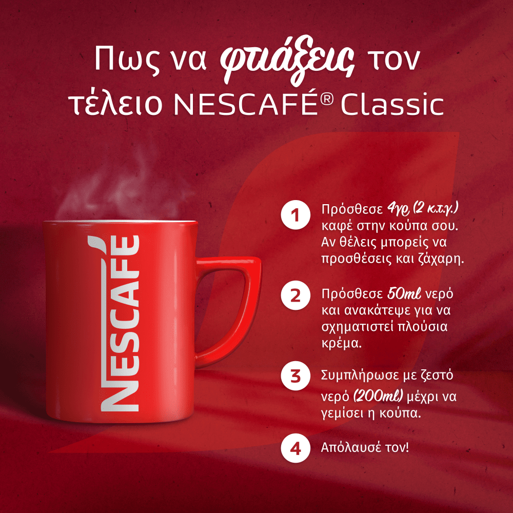 Φτιαγμένος από διαλεχτούς κόκκους καφέ, οι οποίοι καβουρδίζονται, αλέθονται και φιλτράρονται φυσικά, ο καφές NESCAFE® CLASSIC® ξυπνάει τις αισθήσεις σας, κρατώντας σας συντροφιά με τη γνωστή αγαπημένη του γεύση.