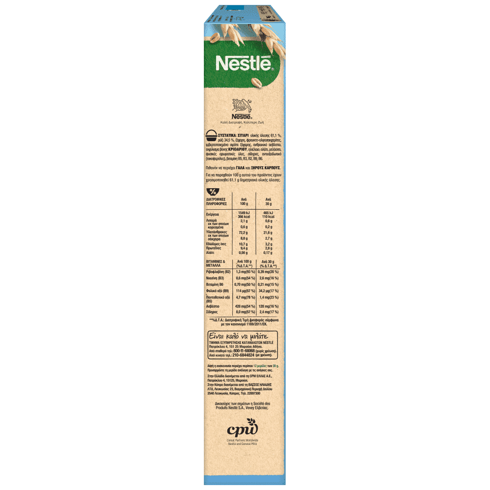 ΣΙΤΑΡΙ ολικής άλεσης 61,1%, ρύζι 34,5%, ζάχαρη, φρουκτο-ολιγοσακχαρίτες, ιμβερτοποιημένο σιρόπι ζάχαρης, ανθρακικό ασβέστιο, εκχύλισμα βύνης ΚΡΙΘΑΡΙΟΥ, ηλιέλαιο, αλάτι, μελάσσα, φυσικές αρωματικές ύλες, σίδηρος, αντιοξειδωτικό (τοκοφερόλες), βιταμίνη Β5, Β3, Β2, Β9, Β6. Περιέχει ΣΙΤΑΡΙ, ΚΡΙΘΑΡΙ. Πιθανόν να περιέχει ΓΑΛΑ και ΞΗΡΟΥΣ ΚΑΡΠΟΥΣ.Αλλεργιογόνα
