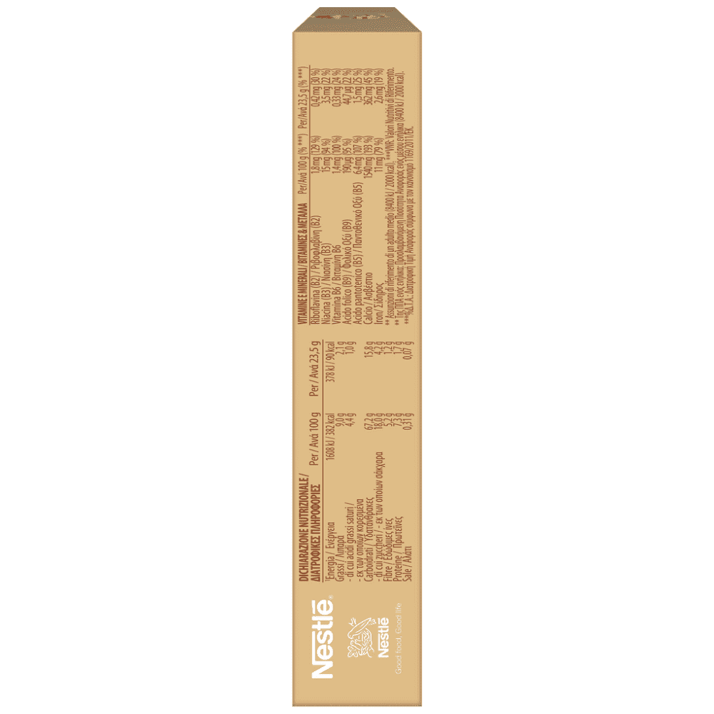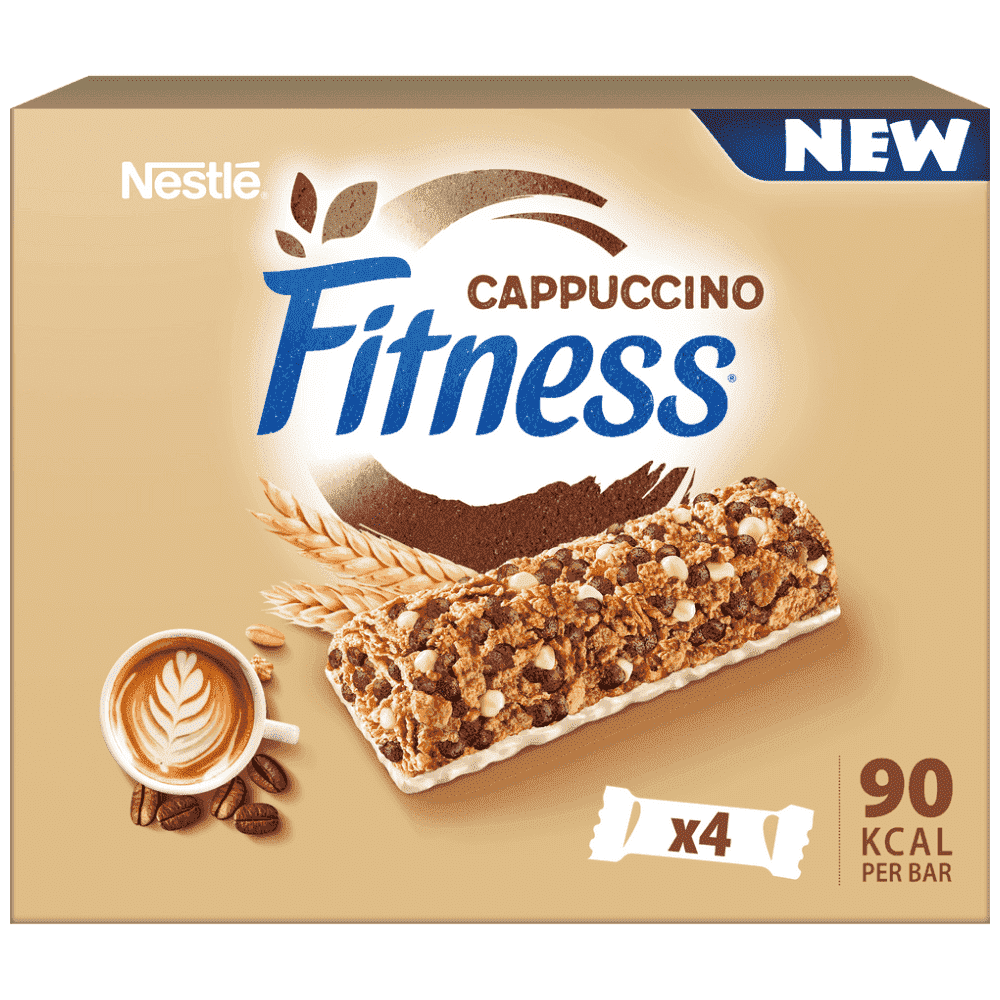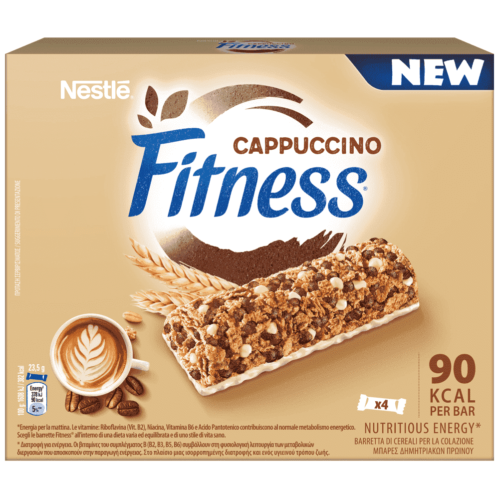 ΣΙΤΑΡΙ ολικής άλεσης 21,9%, σιρόπι γλυκόζης, ρύζι 12,4%, νιφάδες ΒΡΩΜΗΣ ολικής άλεσης 11,2%, ιμβερτοποιημένο σιρόπι ζάχαρης, αλεύρι ΣΙΤΑΡΙΟΥ ολικής άλεσης 6,2%, φυτικά έλαια (ηλιέλαιο, έλαιο καρύδας, λίπος βουτυρόσπερμου), εκχύλισμα βύνης ΚΡΙΘΑΡΙΟΥ, υγροσκοπικά μέσα (γλυκερόλη, σιρόπι σορβιτόλης), κομμάτια λευκής σοκολάτας 5% (ζάχαρη, ΓΑΛΑ σε σκόνη, βούτυρο κακάο, αποβουτυρωμένο ΓΑΛΑ σε σκόνη, γαλακτωματοποιητής (λεκιθίνη ΣΟΓΙΑΣ), φυσική αρωματική ύλη βανίλιας), ζάχαρη, ανθρακικό ασβέστιο, αποβουτυρωμένο ΓΑΛΑ σε σκόνη 3,4%, μαλτοδεξτρίνη, στιγμιαίος καφές 0,6%, σιμιγδάλι καλαμποκιού 0,4%, αλεύρι ρυζιού 0,3%, φυσική αρωματική ύλη, αλάτι, γαλακτωματοποιητής (λεκιθίνη), αποβουτυρωμένο κακάο σε σκόνη 0,1%, κακάο σε σκόνη 0,1%, μελάσσα, σίδηρος, αντιοξειδωτικό (τοκοφερόλες), βιταμίνη Β3, Β5, Β9, Β6, Β2.