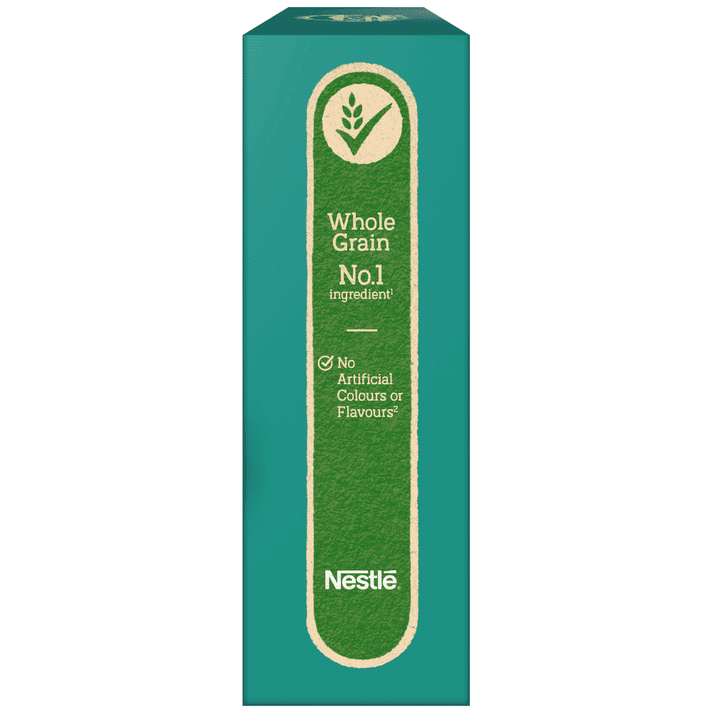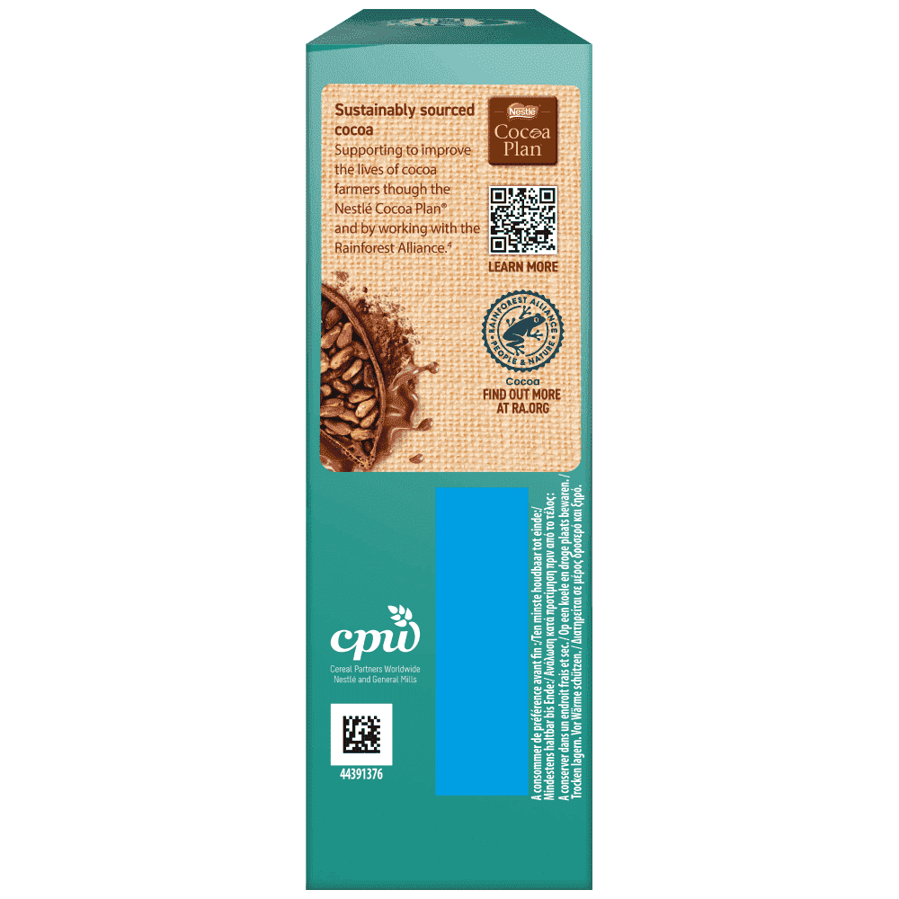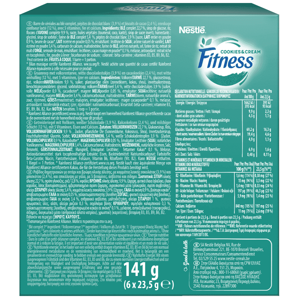 ΣΙΤΑΡΙ ολικής άλεσης 22,6%, σιρόπι γλυκόζης, ρύζι 12,8%, νιφάδες ΒΡΩΜΗΣ ολικής άλεσης 9,9%, ζάχαρη, φυτικά έλαια (ηλιέλαιο, έλαιο καρύδας, λίπος βουτυρόσπερμου), ιμβερτοποιημένο σιρόπι ζάχαρης, υγροσκοπικά μέσα (γλυκερόλη, σιρόπι σορβιτόλης), αλεύρι ΣΙΤΑΡΙΟΥ ολικής άλεσης 5,4%, κομμάτια λευκής σοκολάτας 3,9% (ζάχαρη, ΓΑΛΑ σε σκόνη 0,9%, βούτυρο κακάο 0,8%, αποβουτυρωμένο ΓΑΛΑ σε σκόνη, γαλακτωματοποιητής (λεκιθίνη ΣΟΓΙΑΣ), φυσική αρωματική ύλη βανίλιας), αποβουτυρωμένο ΓΑΛΑ σε σκόνη 3,4%, ανθρακικό ασβέστιο, μαλτοδεξτρίνη, αλεύρι ΣΙΤΑΡΙΟΥ 1%, φυσικές αρωματικές ύλες, αλάτι, αλεύρι ρυζιού 0,3%, εκχύλισμα βύνης ΚΡΙΘΑΡΙΟΥ, σιμιγδάλι καλαμποκιού 0,3%, γαλακτωματοποιητής (λεκιθίνη), αποβουτυρωμένο κακάο σε σκόνη 0,1%, μελάσσα, αντιοξειδωτικό (τοκοφερόλες), σίδηρος, διογκωτικό μέσο (ανθρακικά άλατα νατρίου), χρωστική (καροτένιο), βιταμίνη Β3, Β5, Β9, Β6, Β2. Πιθανόν να περιέχει ΞΗΡΟΥΣ ΚΑΡΠΟΥΣ. Περιέχει ΣΙΤΑΡΙ, ΒΡΩΜΗ, ΓΑΛΑ, ΣΟΓΙΑ, ΚΡΙΘΑΡΙ. Πιθανόν να περιέχει ΞΗΡΟΥΣ ΚΑΡΠΟΥΣ.Αλλεργιογόνα