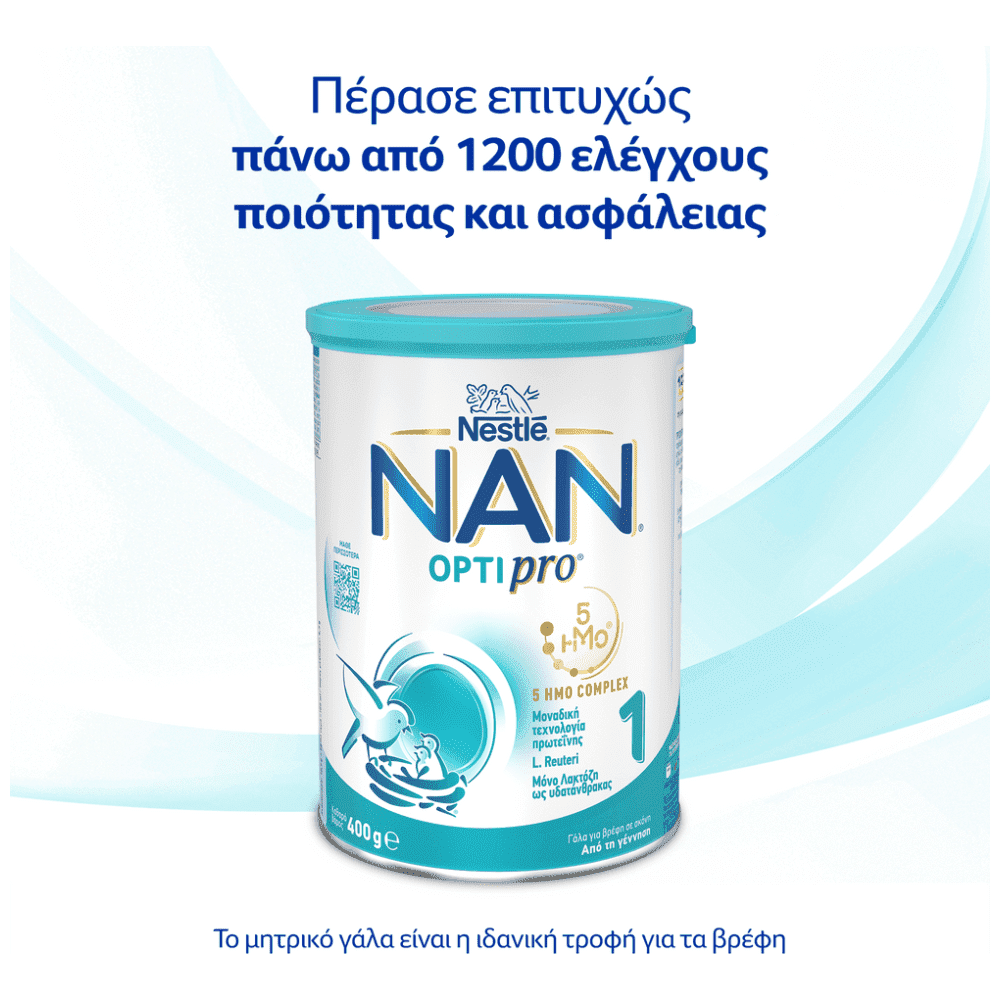 NESTLE NAN OPTIPRO 5 ΗΜΟ Complex 1 400g. Γάλα για βρέφη σε σκόνη από τη γέννηση. Με πάνω από 155 χρόνια εξειδίκευσης της Nestle, στο γάλα ΝΑΝ συνδυάζουμε, με γνώμονα τη μακροχρόνια υγεία των παιδιών, την εφαρμοσμένη επιστήμη, την καινοτομία και την υπόσχεση να νοιαζόμαστε για τον πλανήτη, για το δικό τους εκπληκτικό μέλλον. ΠΡΟΣΦΕΡΟΝΤΑΣ ΟΛΟΚΛΗΡΩΜΕΝΗ ΔΙΑΤΡΟΦΗ, σχεδιασμένη για τις ανάγκες των βρεφών 0-6 μηνών, το NAN OPTIPRO 1 είναι ένα βρεφικό γάλα που σχεδιάσαμε εμπνευσμένοι από τις έρευνες της Nestle για τη σωστή διατροφή των βρεφών.ntOPTIPRO, ΜΙΑ ΜΟΝΑΔΙΚΗ ΤΕΧΝΟΛΟΓΙΑ ΠΡΩΤΕΪΝΗΣ 5 ΗΜΟ COMPLEX (2’-FL, DFL, LNT, 3’-SL, 6’-SL), ένας εξελιγμένος συνδυασμός ολιγοσακχαριτών. L.REUTERI ΜΟΝΟ ΛΑΚΤΟΖΗ ΩΣ ΥΔΑΤΑΝΘΡΑΚΑΣ DHA, *όπως απαιτείται από τη νομοθεσία για όλα τα παρασκευάσματα 2ης βρεφικής ηλικίας. ΥΠΟΣΤΗΡΙΖΟΥΜΕ ΠΡΑΚΤΙΚΕΣ ΠΟΥ ΦΡΟΝΤΙΖΟΥΝ ΤΟ ΠΕΡΙΒΑΛΛΟΝ ΓΙΑ ΤΙΣ ΕΠΟΜΕΝΕΣ ΓΕΝΙΕΣ, ΑΝΑΚΥΚΛΩΣΙΜΗ ΣΥΣΚΕΥΑΣΙΑ, ΤΟΥΛΑΧΙΣΤΟΝ 66% ΤΟΥ ΠΛΑΣΤΙΚΟΥ ΑΠΟ ΖΑΧΑΡΟΚΑΛΑΜΟ, μια ανανεώσιμη πηγή για να παραχθεί η μεζούρα και το καπάκι.